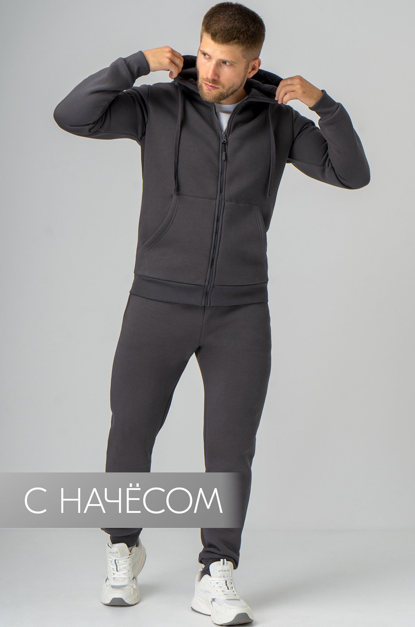 Теплый мужской костюм темно-серого цве..показатьта от бренда Happyfox выполнен из трикотажа футер с начесом. В комплект входят толстовка с капюшоном и брюки-джоггеры, созданные для максимального комфорта и свободы движений.