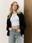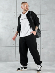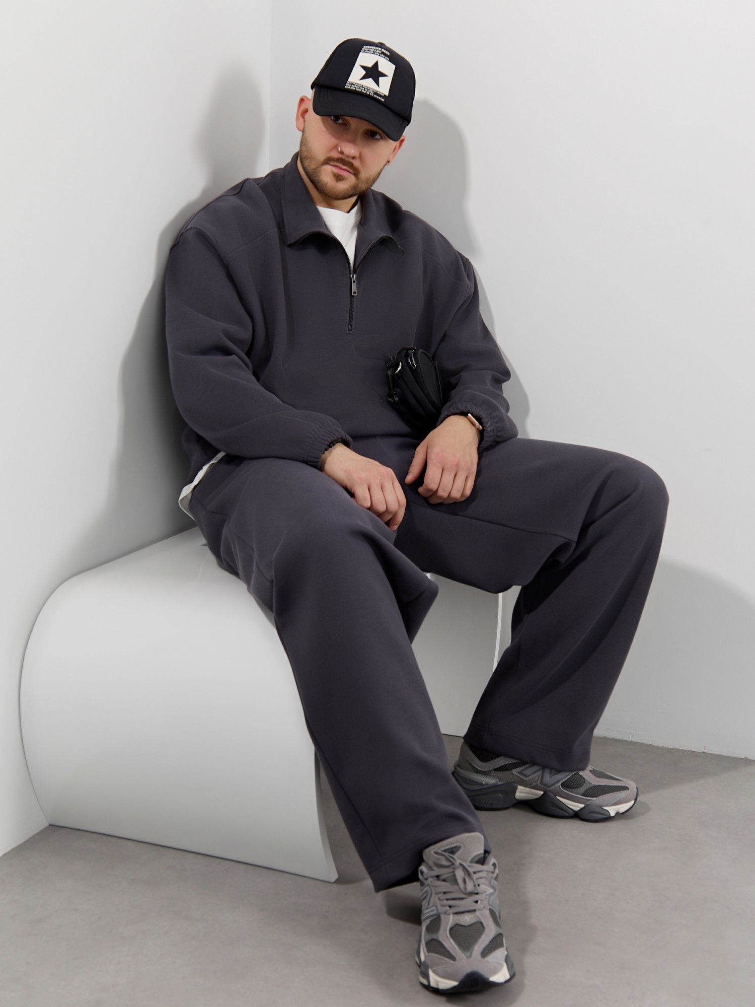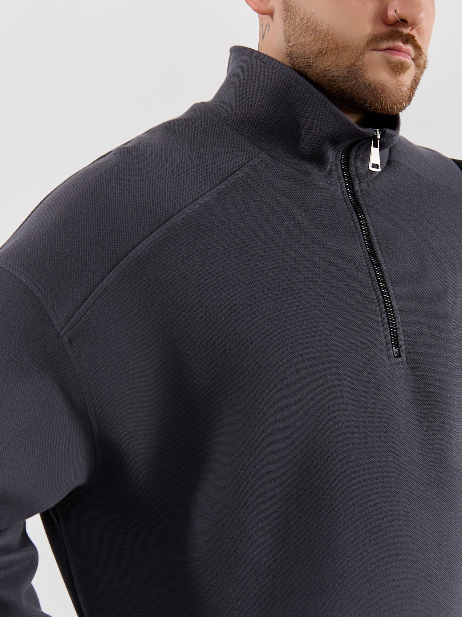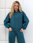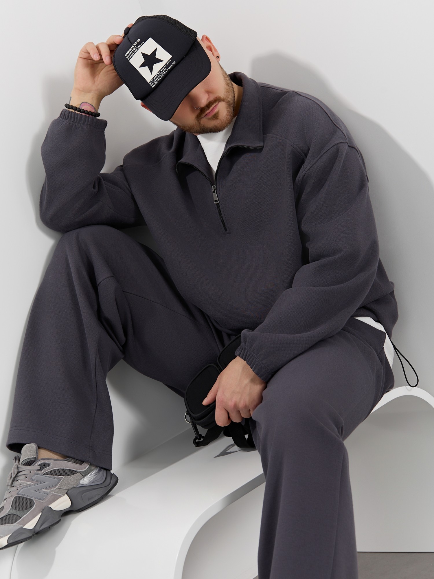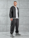 Толстовка мужская из трикотажного полотна "интерло-пике". Толстовка свободного покроя, с длинными втачными рукавами, заниженными проймами и воротником-стойкой. Полочка с кокетками, с неразъемной застежкой "молния", обработанной в рамке. Нижние срезы рукавов обработаны с эластичной тесьмой, нижний срез изделия - подгибкой, с эластичным шнуром и фиксаторлм для регулировки ширины изделия на этом участке.