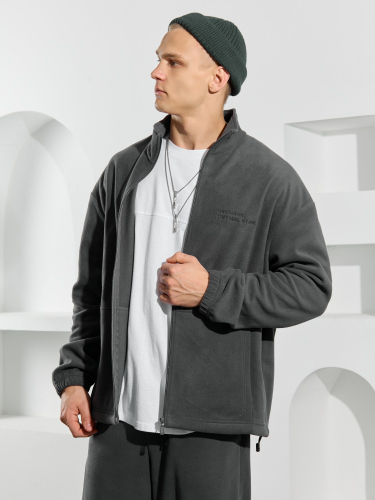 Жилет мужской из флиса, прилегающего силуэта, с воротником-стойкой , центральной боротовой застежкой на тесьму "молния" и вертикальными рельефами на полочках, в швах которых обработаны карманы. Проймы и низ изделия обработаны подгибкой. В нижней части левого бокового шва вставлен небольшой декоративный элемент из репсовой ленты.