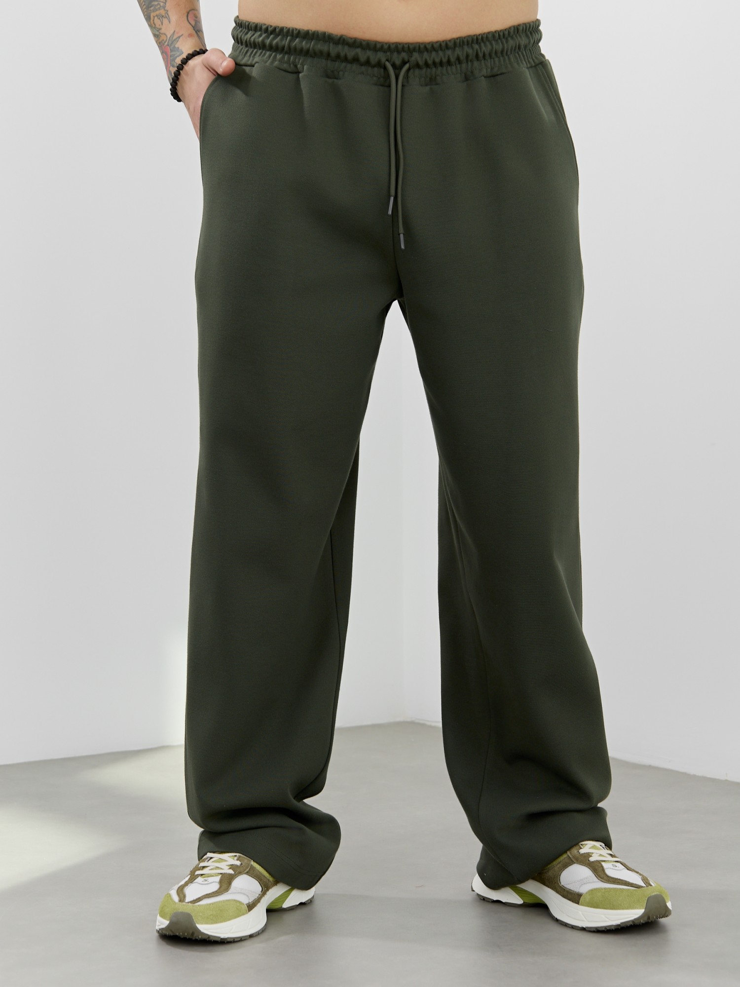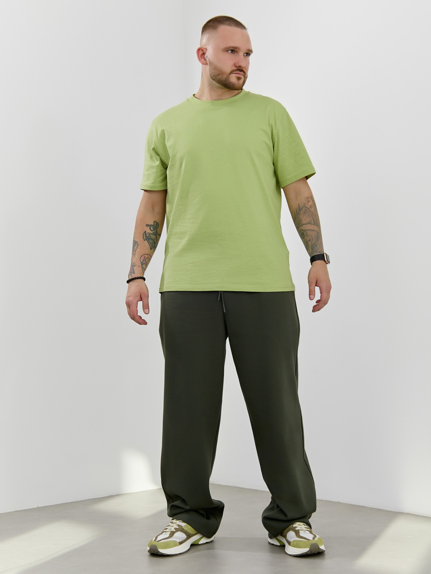 Брюки мужские из трикотажного полотна "интерлок-пике", на притачном поясе с эластичной тесьмой внутри, с карманами в боковых швах. Низ брюк прямой с подгибкой. Для регулирования степени прилегания изделия по линии талии предусмотрен декоративный шнурок, вставленный в пояс и продетый через две обметанные петли в центре.