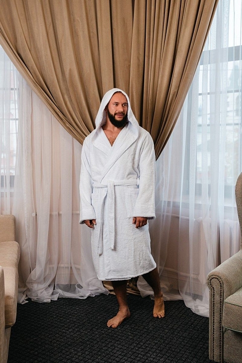 Махровая ткань из 100% хлопка идеально согревает и быстро высушивает кожу после водных процедур. Капюшон убережет шею и голову от сквозняков и резкой смене внешней температуры, особенно актуально при посещении бани в холодное время года.