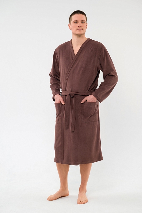 Халат мужской из махры Ренат темно-коричневый на запах, с длинными рукавами.