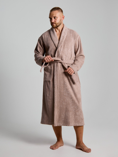 Мужской халат из двустороннего махрового хлопкового полотна. Модель на запах, с поясом в шлёвках, с боковыми карманами, с воротником "шаль", с петлей-вешалкой по горловине спинки.