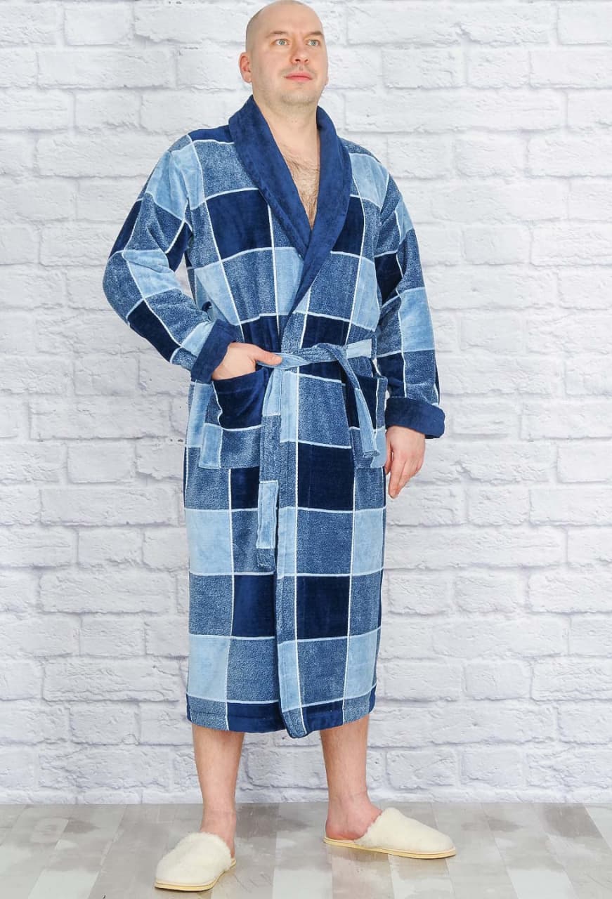 Уютный, мягкий махровый халат для шикарных мужчин. Модель с глубокими накладными карманами, воротник-шалька, рукава с отворотом. Изделие высокого качества, изнутри махровая петля, снаружи велюр, удобные двух-уровневые шлёвки для пояса, в воротник вшита петелька. По всему халату набивной рисунок.