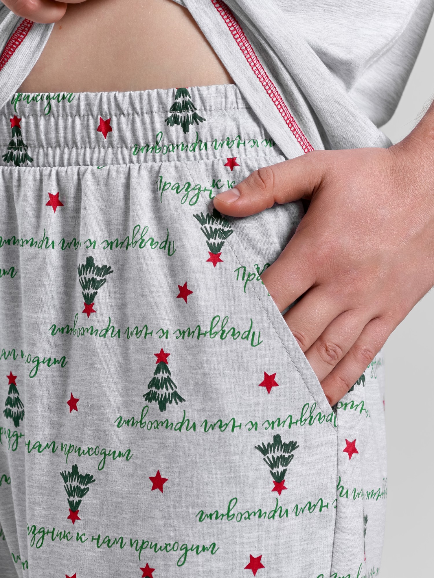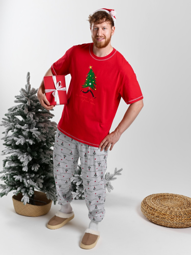 Костюм мужской из трикотажного полотна в комбинации двух видов: полотна "кулирка-кармеланж" и полотна "кулирка"с набивным тематическим рисунком на сером фоне , состоящий из футболки и брюк. Футболка - классического силуэта, свободного покроя, с приспущенным плечом, с втачными рукавами длиной до локтя, горловиной овальной формы, обработанной втачной планкой и принтом в центре переда. По шву втачивания планки настрочена декоративная (5-ниточная) отделочная строчка нитками контрастного цвета Подгибка низа рукавов и изделия так же выполнена с применением декоративной отделочной строчки. Брюки выполнены из полотна с набивным тематическим рисунком, длинные, умеренной ширины, прямые, на притачном поясе с эластичной тесьмй внутри и карманами в боковых швах.