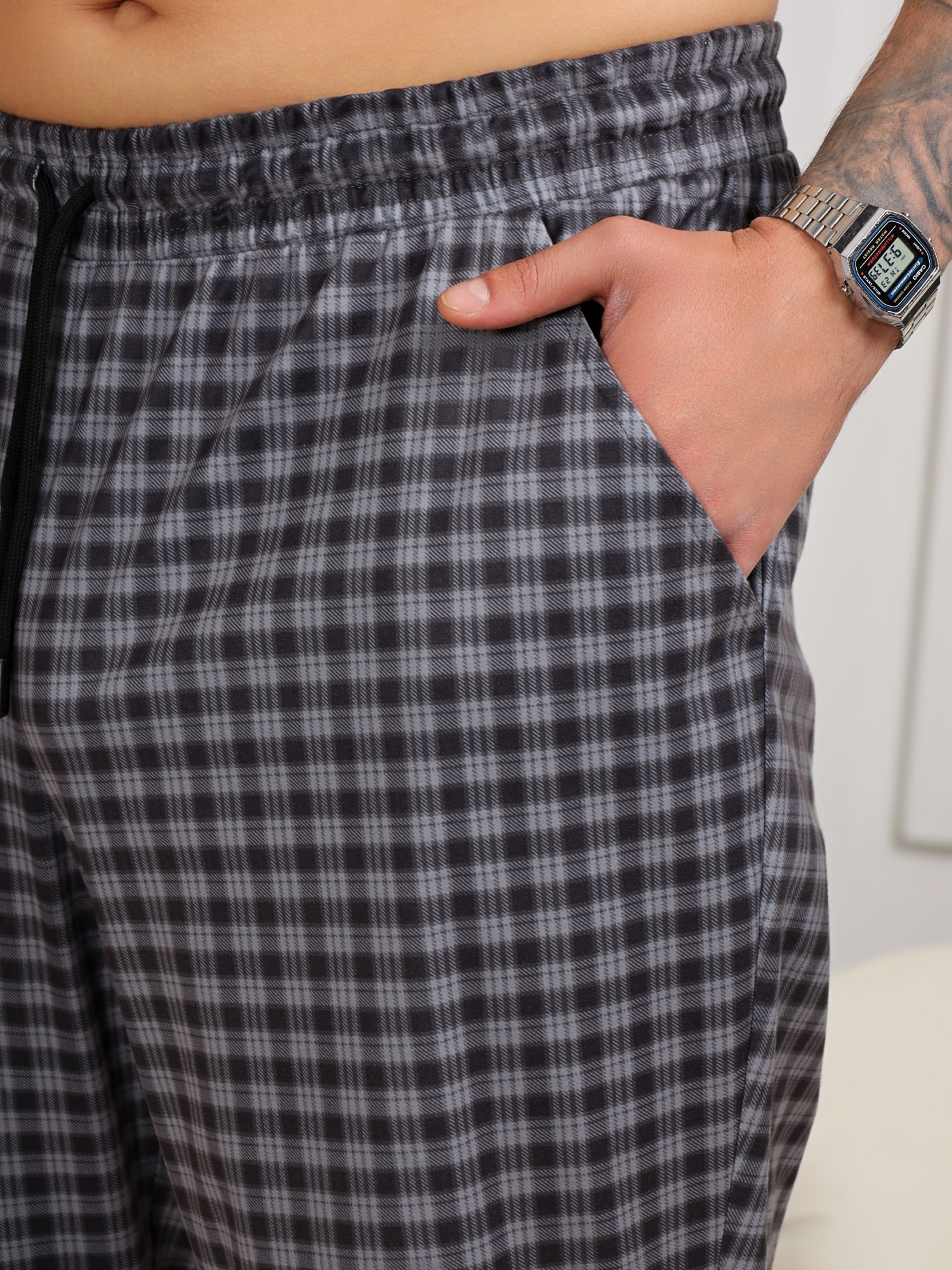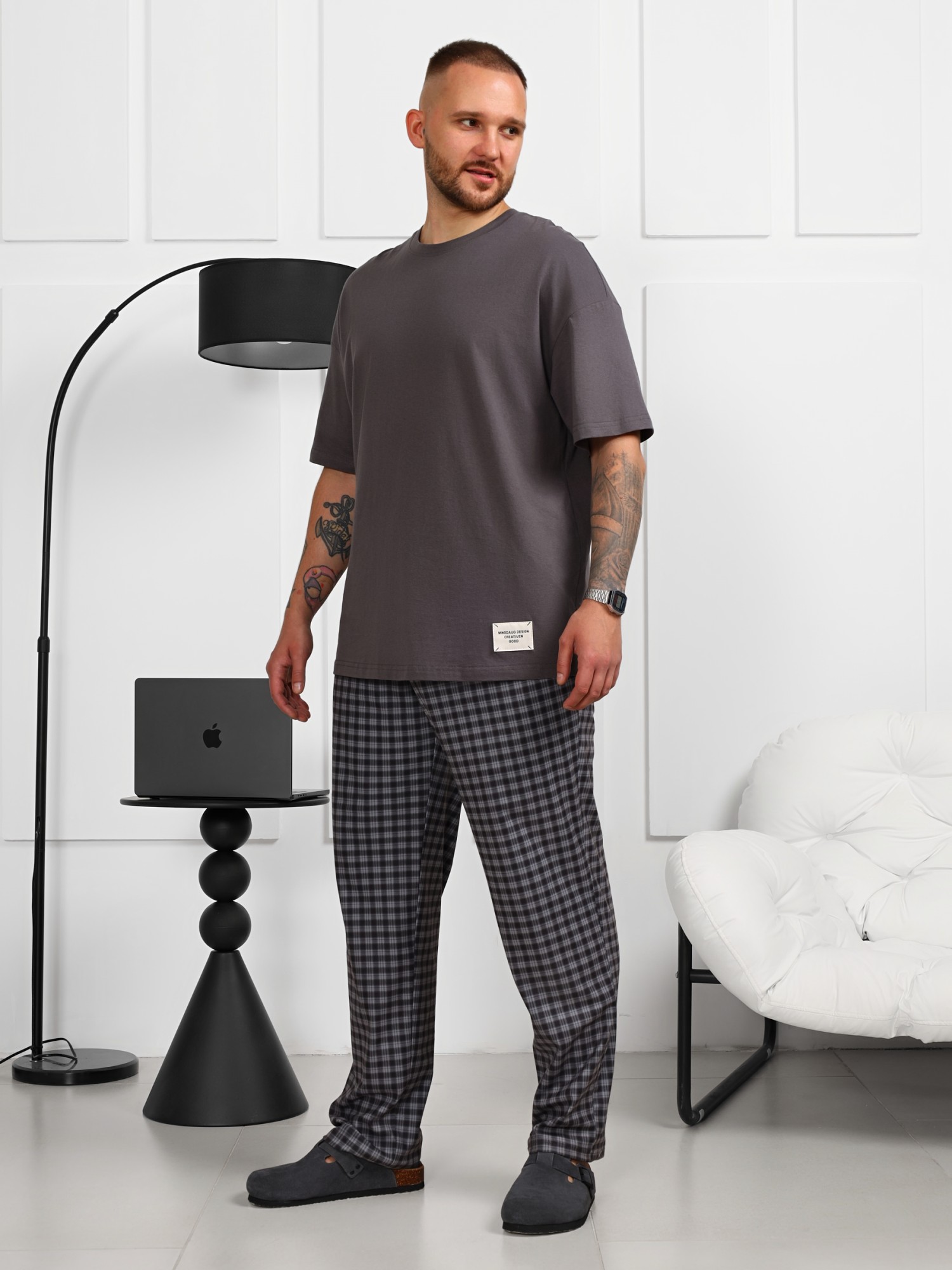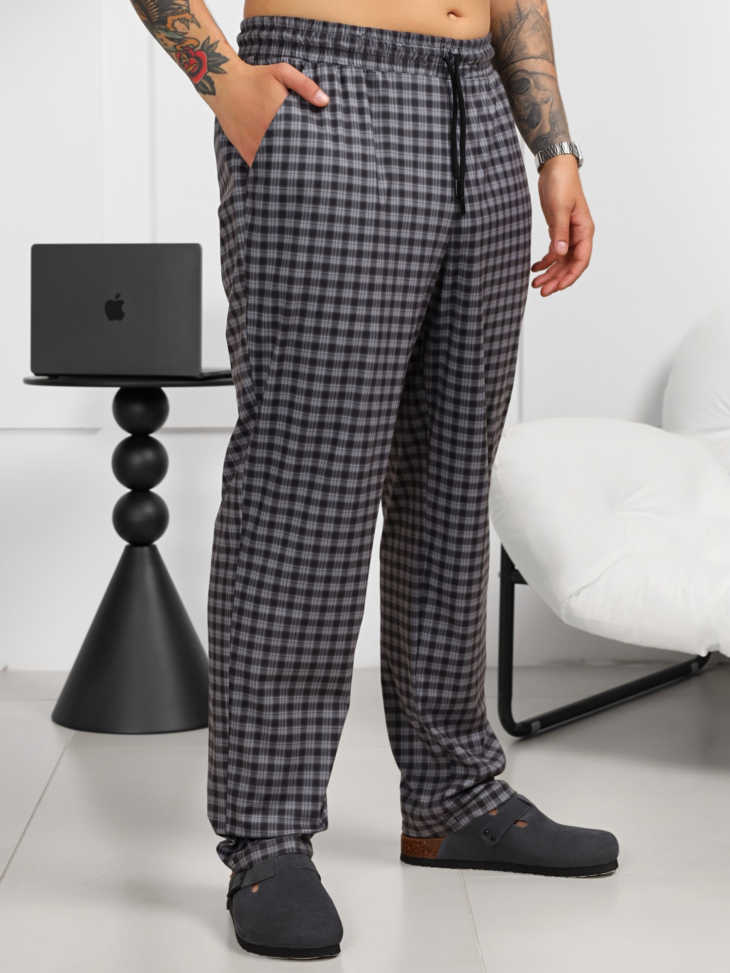 Брюки в мелкую клетку из трикотажной "фланели". Модель на притачном поясе с эластичной тесьмой внутри, с карманами в боковых швах. Пояс с двумя обметанными петлями по центру, в которые вдет шнурок с наконечниками для регулирования степени прилегания изделия по талии.