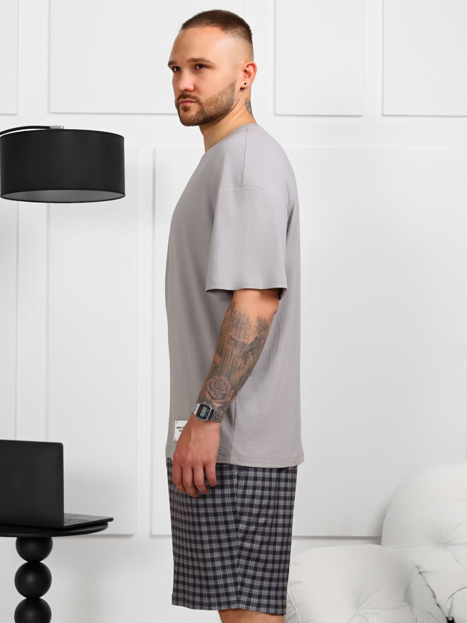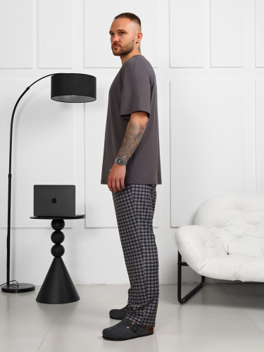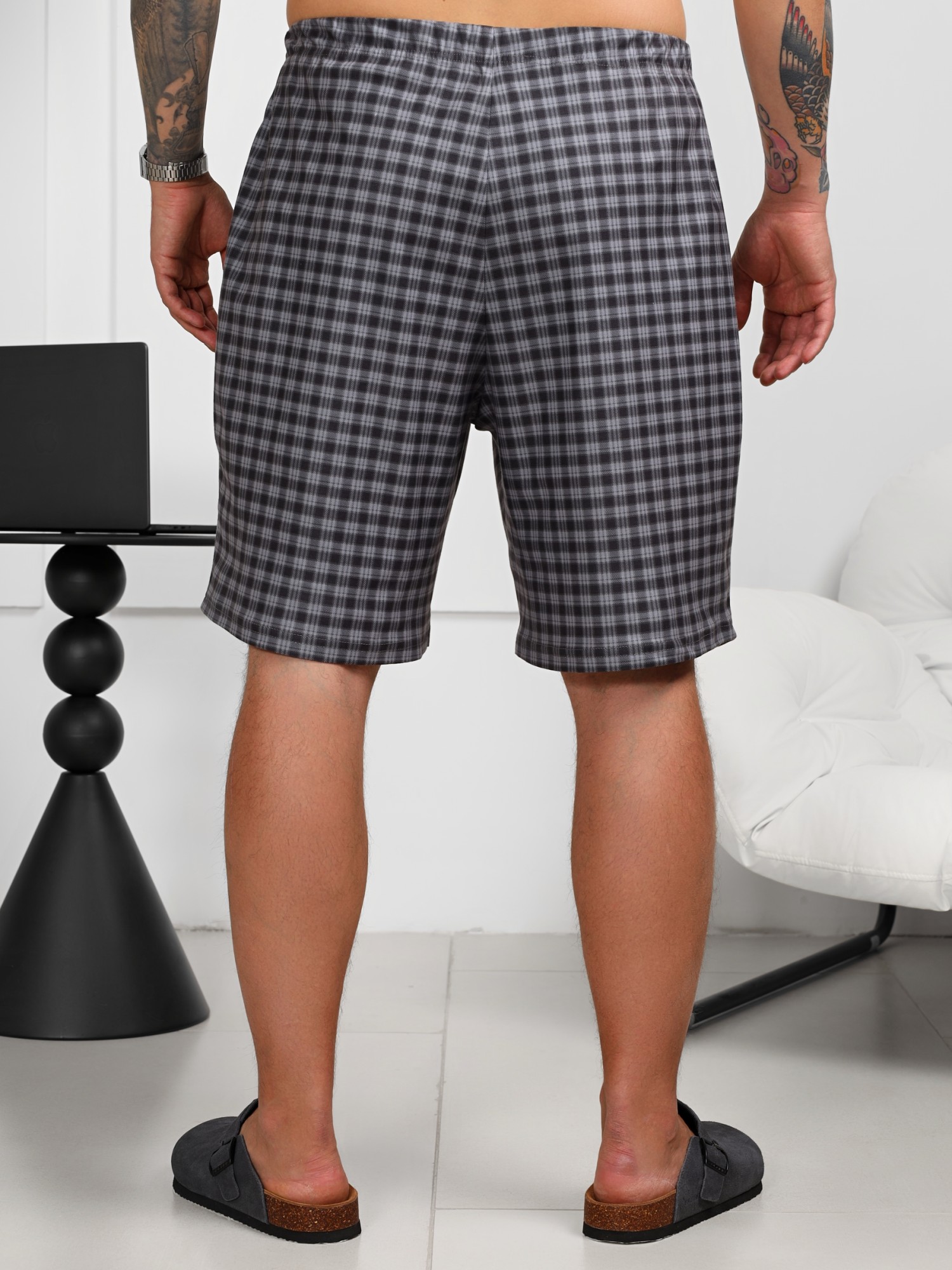 Шорты в мелкую клетку из трикотажной "фланели". Модель средней длины, на цельнокроеном поясе с эластичной тесьмой внутри, с карманами в боковых швах.