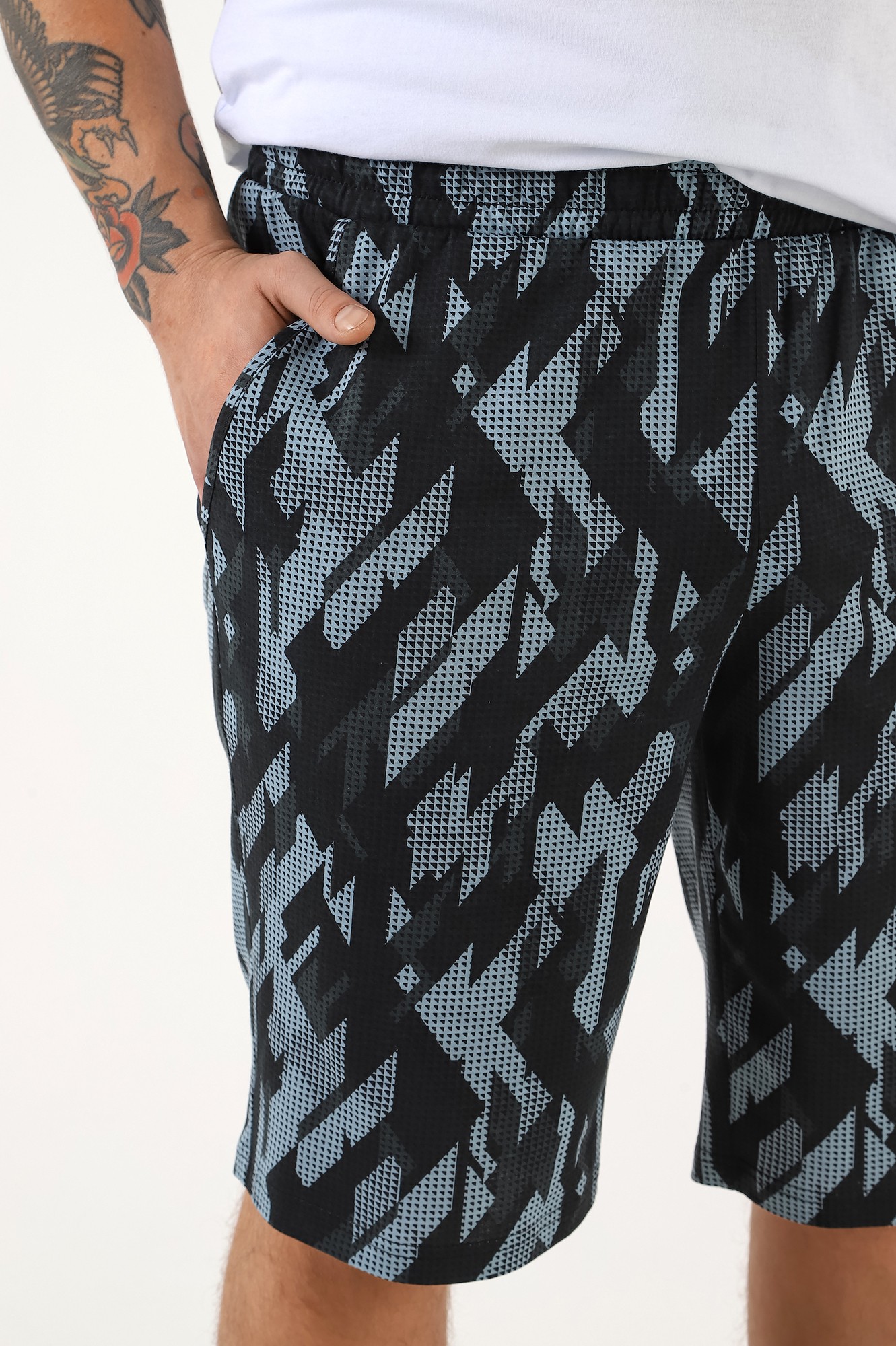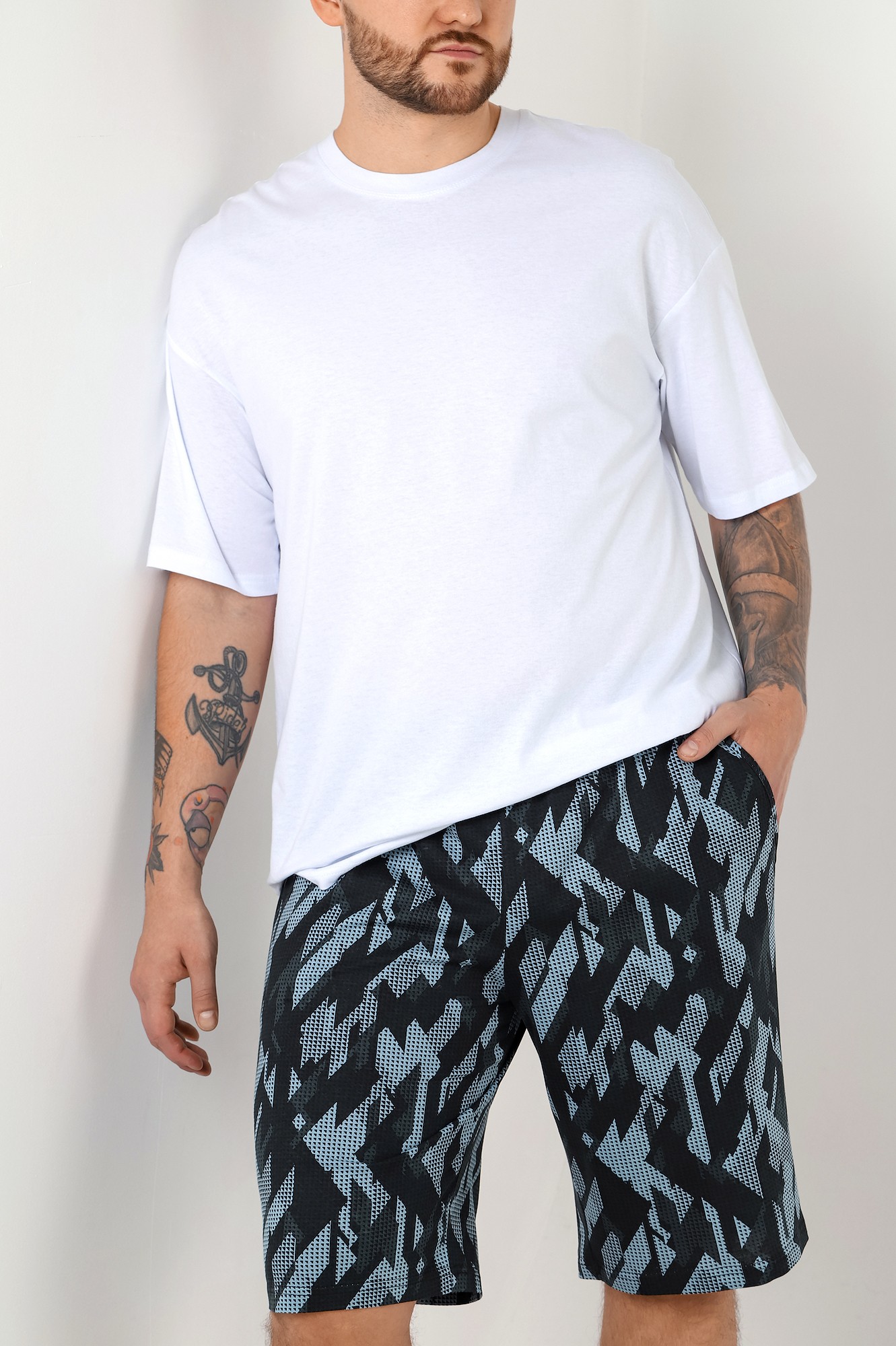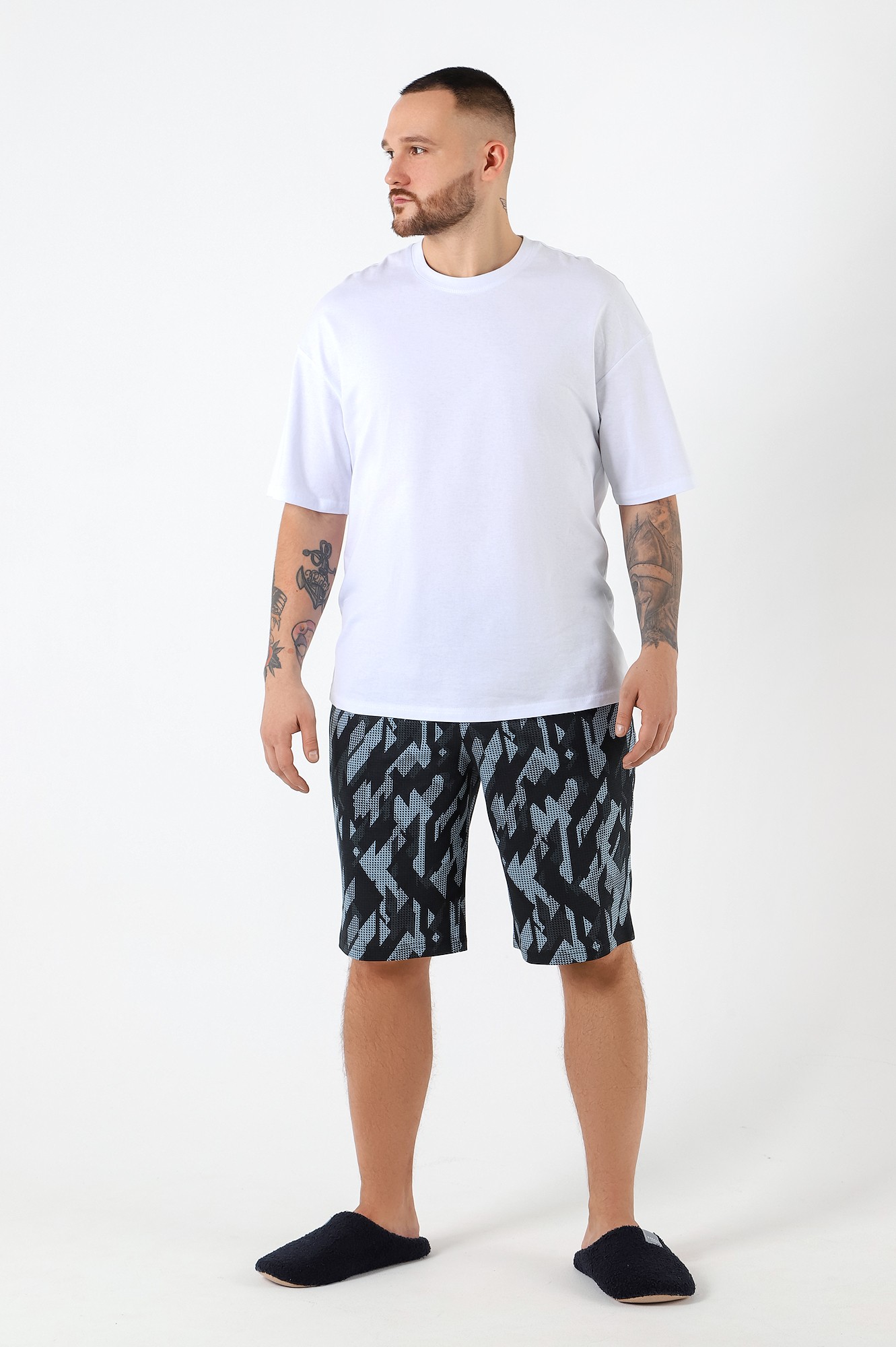 Шорты мужские из трикотажного полотна "кулирка" с набивным рисунком, удлиненные, на притачном поясе с эластичной тесьмой внутри, с карманами в боковых швах, входы в которые окантованы основным материалом.