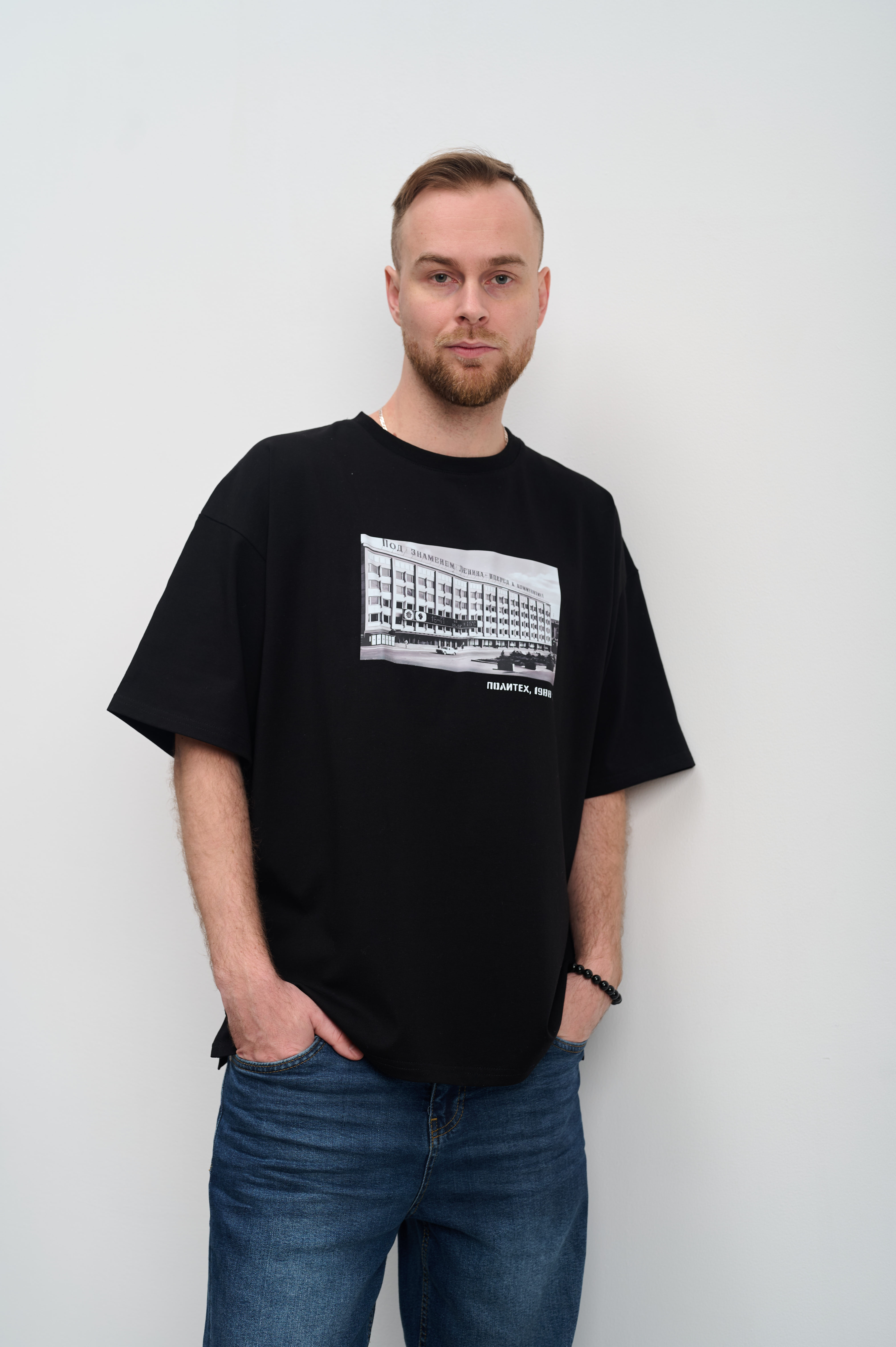 Футболка унисекс в стиле оверсайз из серии "Архитектура", на груди изображено здание "Марийского политехнического института".