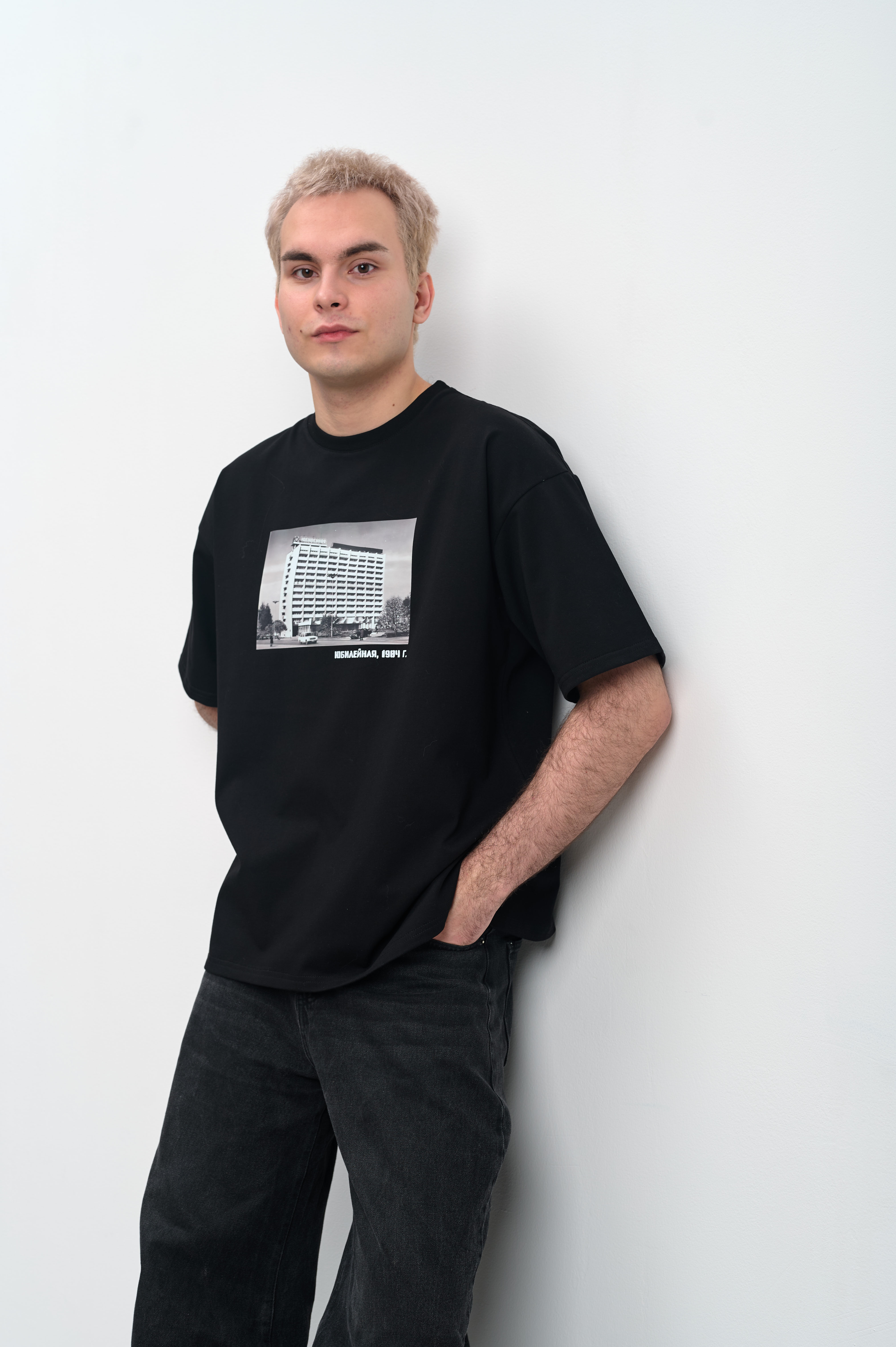 Футболка унисекс в стиле оверсайз из серии "Архитектура", на груди изображено здание гостиницы "Юбилейная".