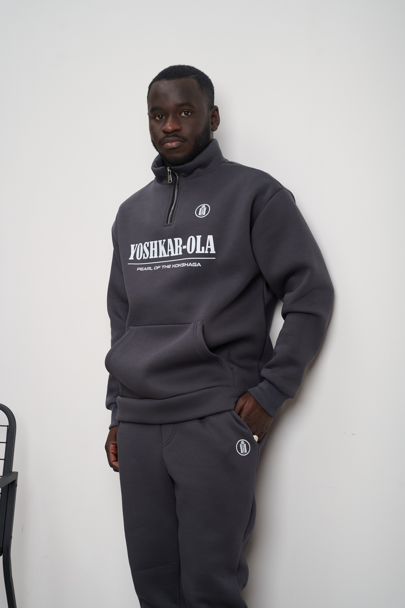 Мужской костюм из теплого трикотажа с начесом, состоит из толстовки с воротником и брюк-джоггеров. Фирменный принт из серии "Yoshkar-Ola".