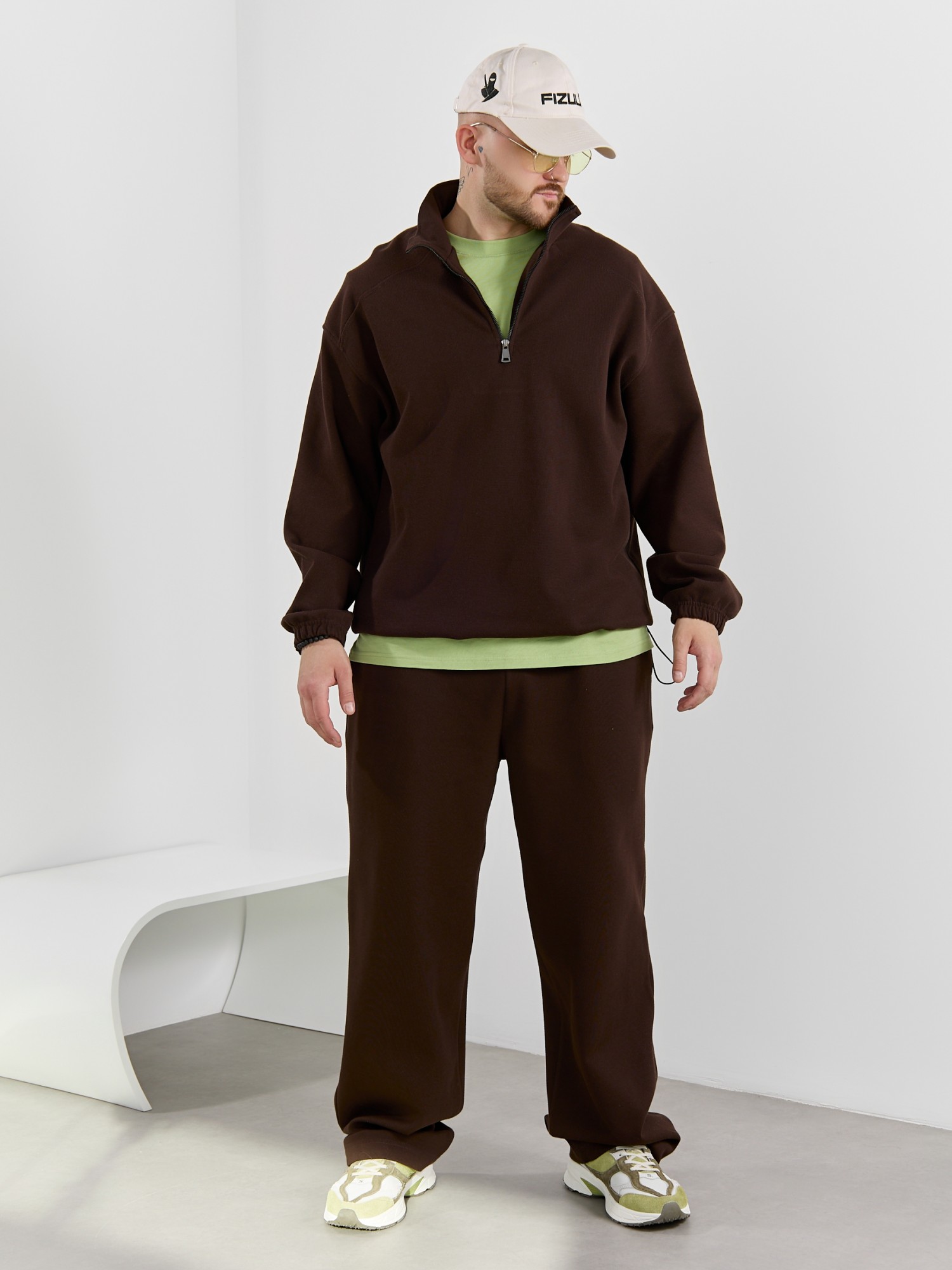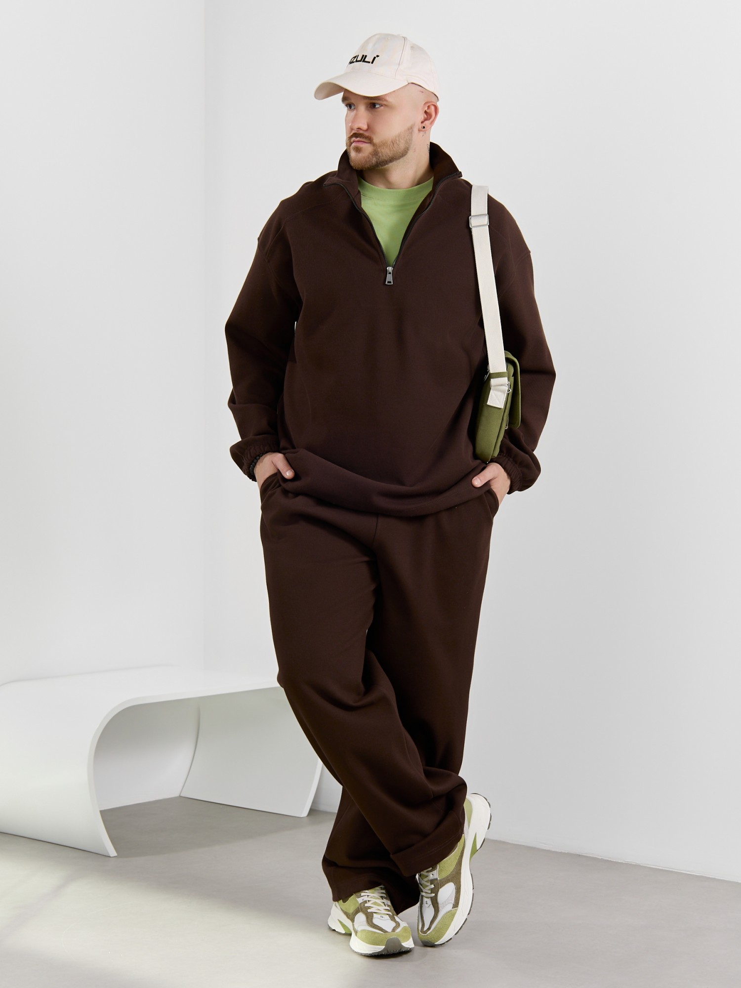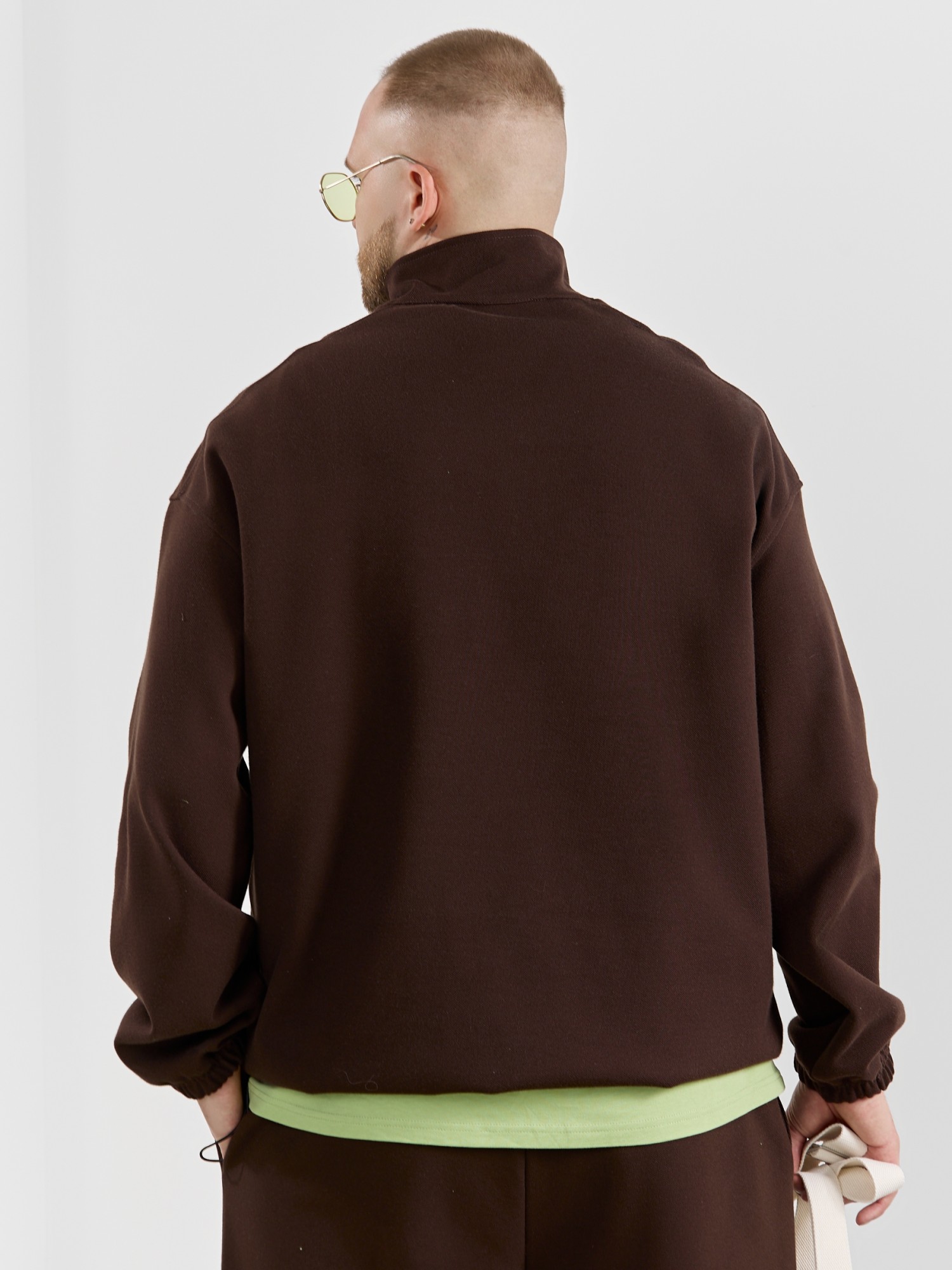 Толстовка мужская из трикотажного полотна "интерло-пике". Толстовка свободного покроя, с длинными втачными рукавами, заниженными проймами и воротником-стойкой. Полочка с кокетками, с неразъемной застежкой "молния", обработанной в рамке. Нижние срезы рукавов обработаны с эластичной тесьмой, нижний срез изделия - подгибкой, с эластичным шнуром и фиксаторлм для регулировки ширины изделия на этом участке.