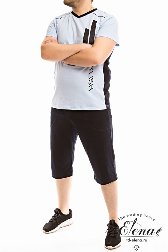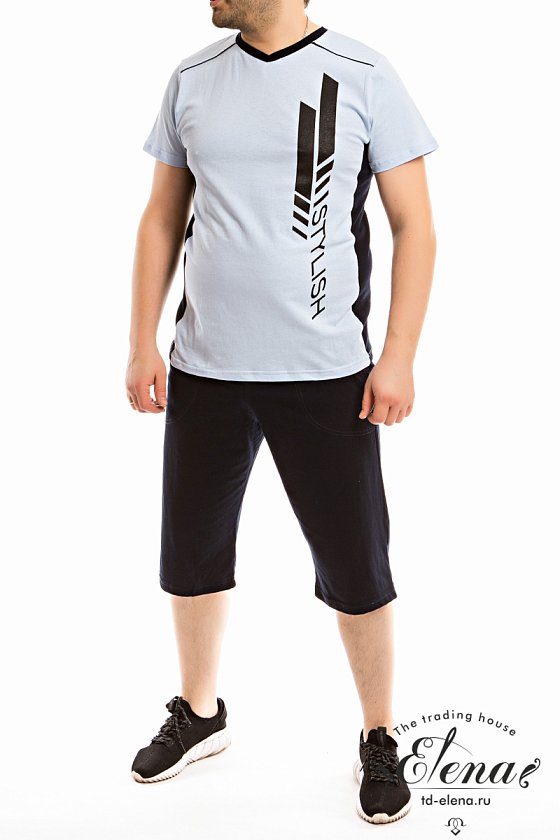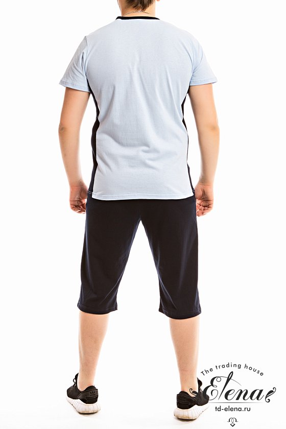Мужской костюм выполнен из хлопкового полотна, состоит из футболки и капри. Футболка выполнена из полотен двух цветов, вырез горловины V-образный, спереди нанесён принт. Капри с поясом на резинке и карманами по бокам.