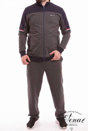 Мужской спортивный костюм из футер петли, куртка с карманами, длинным рукавом, капюшоном, застёжкой на молнию. Брюки с карманами по бокам, пояс на резинке и шнуре, внизу на манжетах. На куртке и штанах вставки из полотна контрастного цвета.