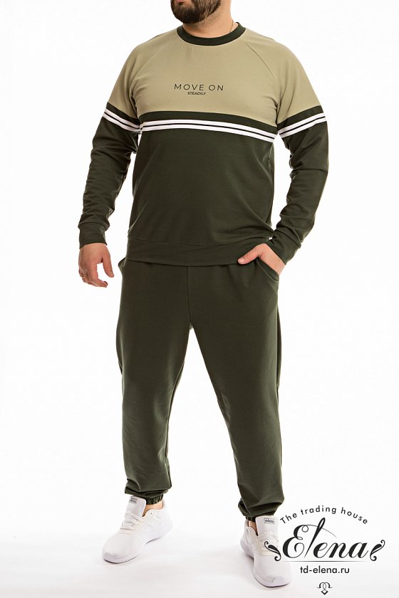 Костюм выполнен из однотонного футера с лайкрой. Костюм состоит из брюк и толстовки. Толстовка с рукавом реглан, притачным поясом и манжетами. На толстовке в качестве отделки лампасы и принт. Брюки с притачным поясом на резине и шнуре. Низ брюк собран на резинку, по бокам размещены карманы.