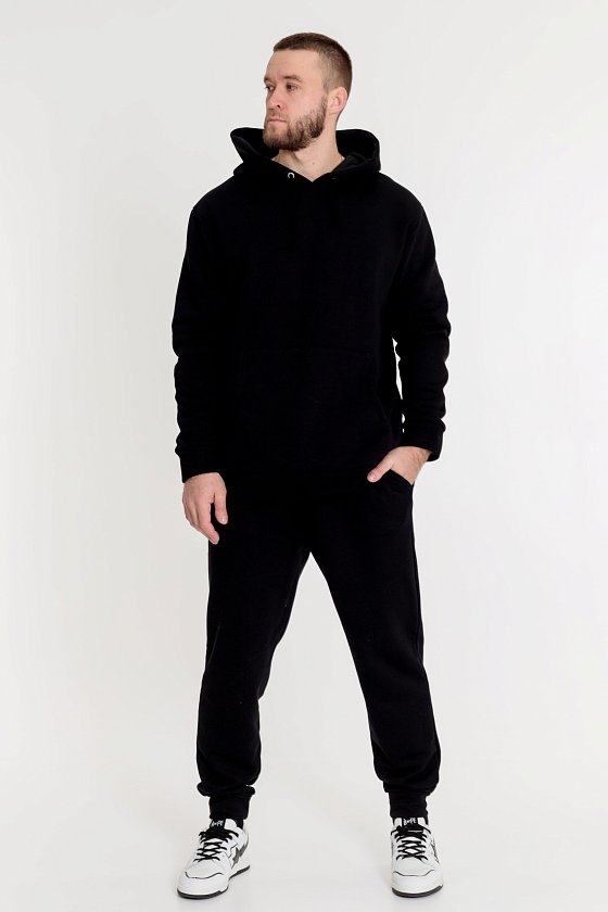 Костюм для мужчин выполнен из высококачественного полотна с начёсом. Толстовка с капюшоном (ширина регулируется при помощи шнура), застёжкой на молнию и карманом кенгуру. Рукава реглан с притачными манжетами. Брюки с боковыми карманами и притачным поясом, низ на резинке.