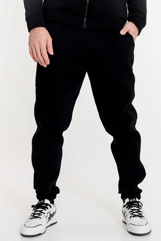 Костюм для мужчин выполнен из высококачественного полотна с начёсом. Толстовка с капюшоном (ширина регулируется при помощи шнура), застёжкой на молнию и карманом кенгуру. Рукава реглан с притачными манжетами. Брюки с боковыми карманами и притачным поясом, низ на резинке.