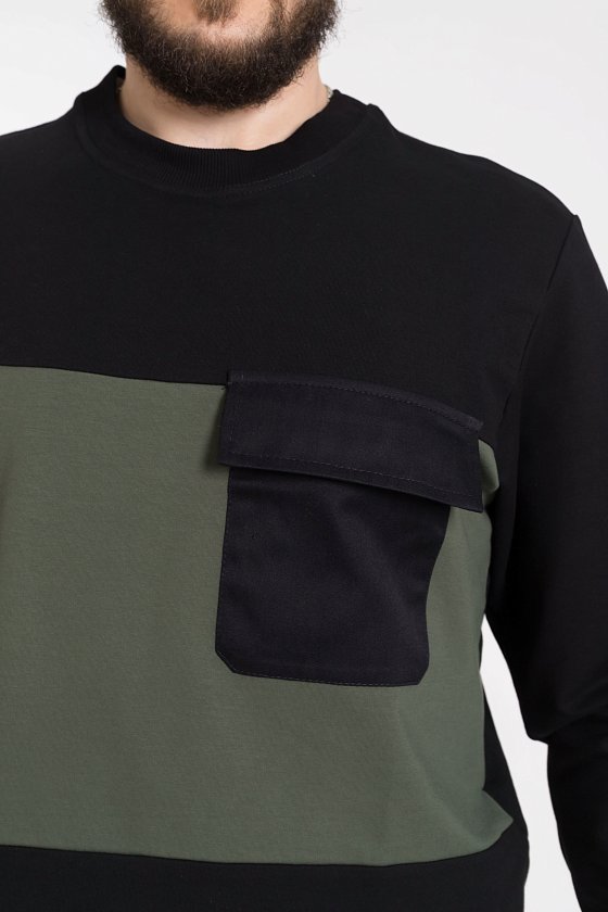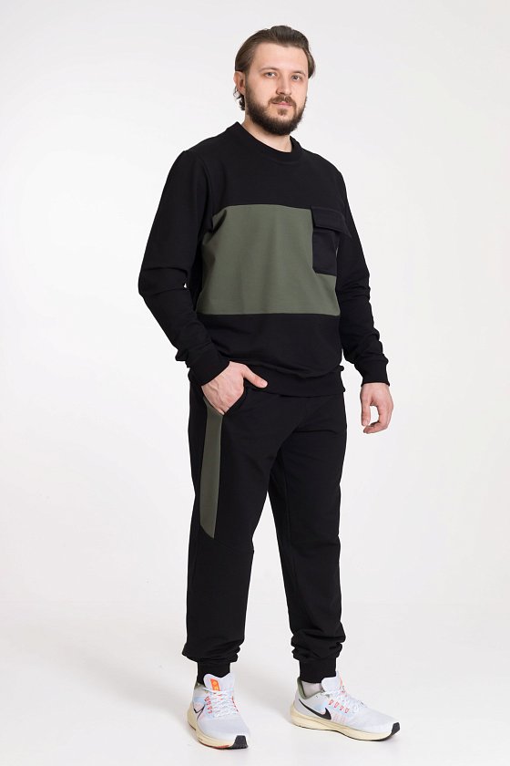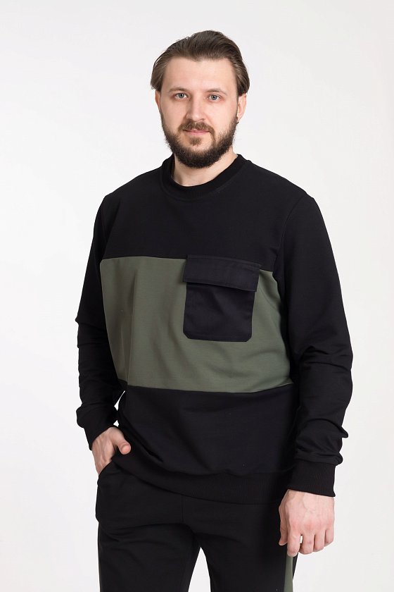 Толстовка - длинный втачной рукав, круглый вырез горловины, рукав и низ тостовки на манжетах, слева на полочке накладной карман.