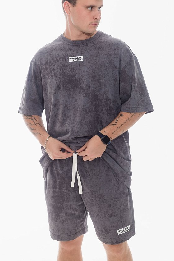 Мужской костюм — отличный выбор для повседневной носки. Он состоит из футболки и шорт, выполненных из качественного хлопкового полотна, что обеспечивает комфорт и удобство в носке. Футболка имеет спущенную линию плеча и короткие рукава, а также интересный принт спереди. Шорты оснащены карманами по бокам и поясом на широкой резинке со шнуром. Кроме того, принт на штанинах шорт соответствует принту на футболке, создавая стильный и гармоничный образ. Такой костюм идеально подойдёт для прогулок, неформальных встреч или отдыха.