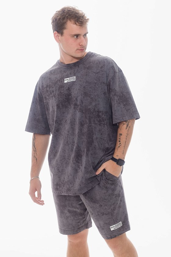 Мужской костюм — отличный выбор для повседневной носки. Он состоит из футболки и шорт, выполненных из качественного хлопкового полотна, что обеспечивает комфорт и удобство в носке. Футболка имеет спущенную линию плеча и короткие рукава, а также интересный принт спереди. Шорты оснащены карманами по бокам и поясом на широкой резинке со шнуром. Кроме того, принт на штанинах шорт соответствует принту на футболке, создавая стильный и гармоничный образ. Такой костюм идеально подойдёт для прогулок, неформальных встреч или отдыха.