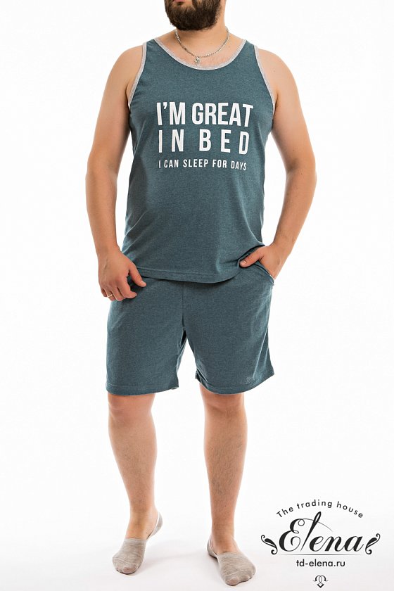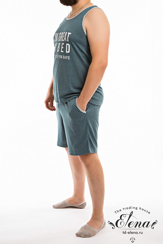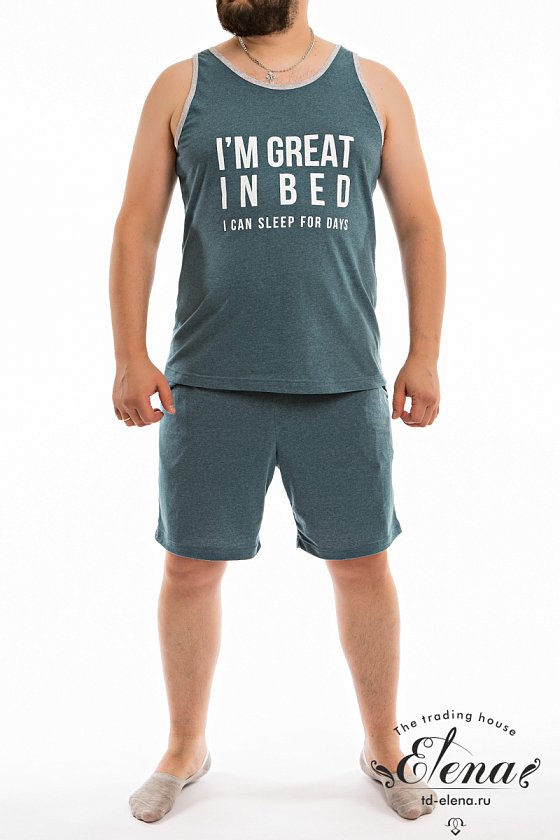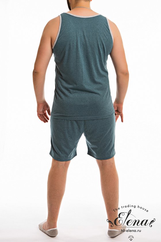 Костюм выполнен из однотонной кулирки, состоит из шорт и майки. Майка с отделочной бейкой и принтом спереди. Шорты с притачным поясом и боковыми карманами, через петли в пояс продёрнут шнур.