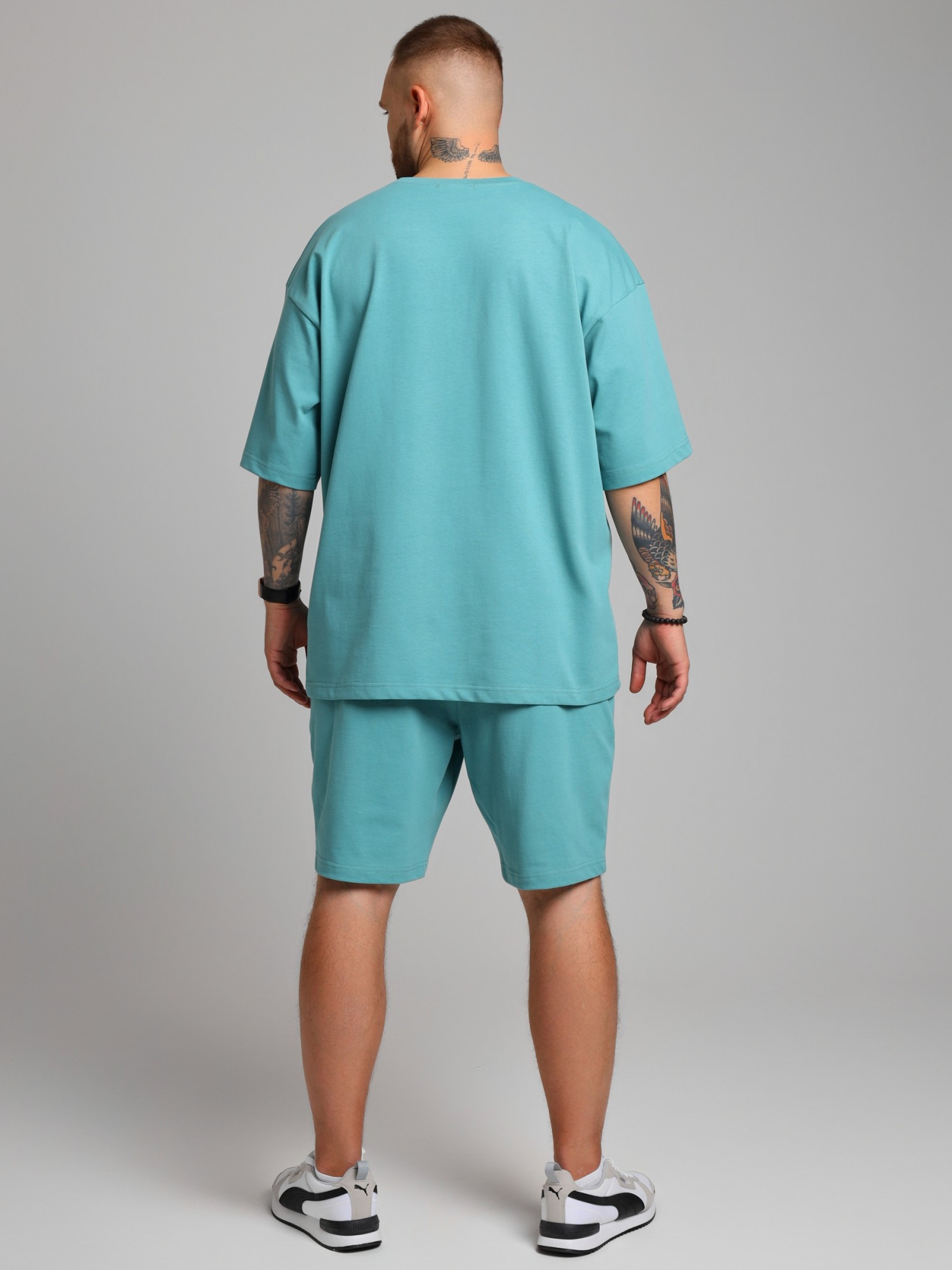 Костюм мужской из плотного гладкокрашеного трикотажного полотна "кулирка", состоящий из футболки и шорт. Футболка - свободного покроя, с удлиненными плечевым и швами, короткими втачными рукавами и горловиной овальной формы, обработанной втачной планкой. В нижней части переда слева настрочен декоративный элемент прямоугольной формы. По горловине проложена отделочная строчка. Шорты - классического покроя, на притачном поясе с эластичной тесьмой внутри и карманами в боковых швах. Для регулирования степени прилегания шорт по талии в пояс вставлен шнурок, продетый через две петли в центре пояса.
