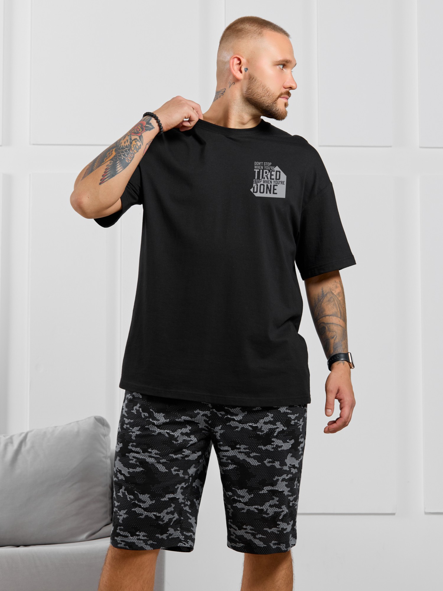 Костюм мужской, состоящий из футболки и шорт. Футболка однотонная с принтом на груди; модель свободная, со спущенной линией плеч. Шорты из полотна с набивным рисунком эксклюзивного дизайна, с боковыми карманами с обтачными входами, на притачном поясе с отстроченной эластичной тесьмой.