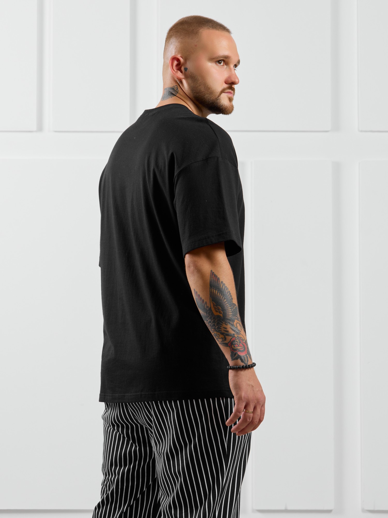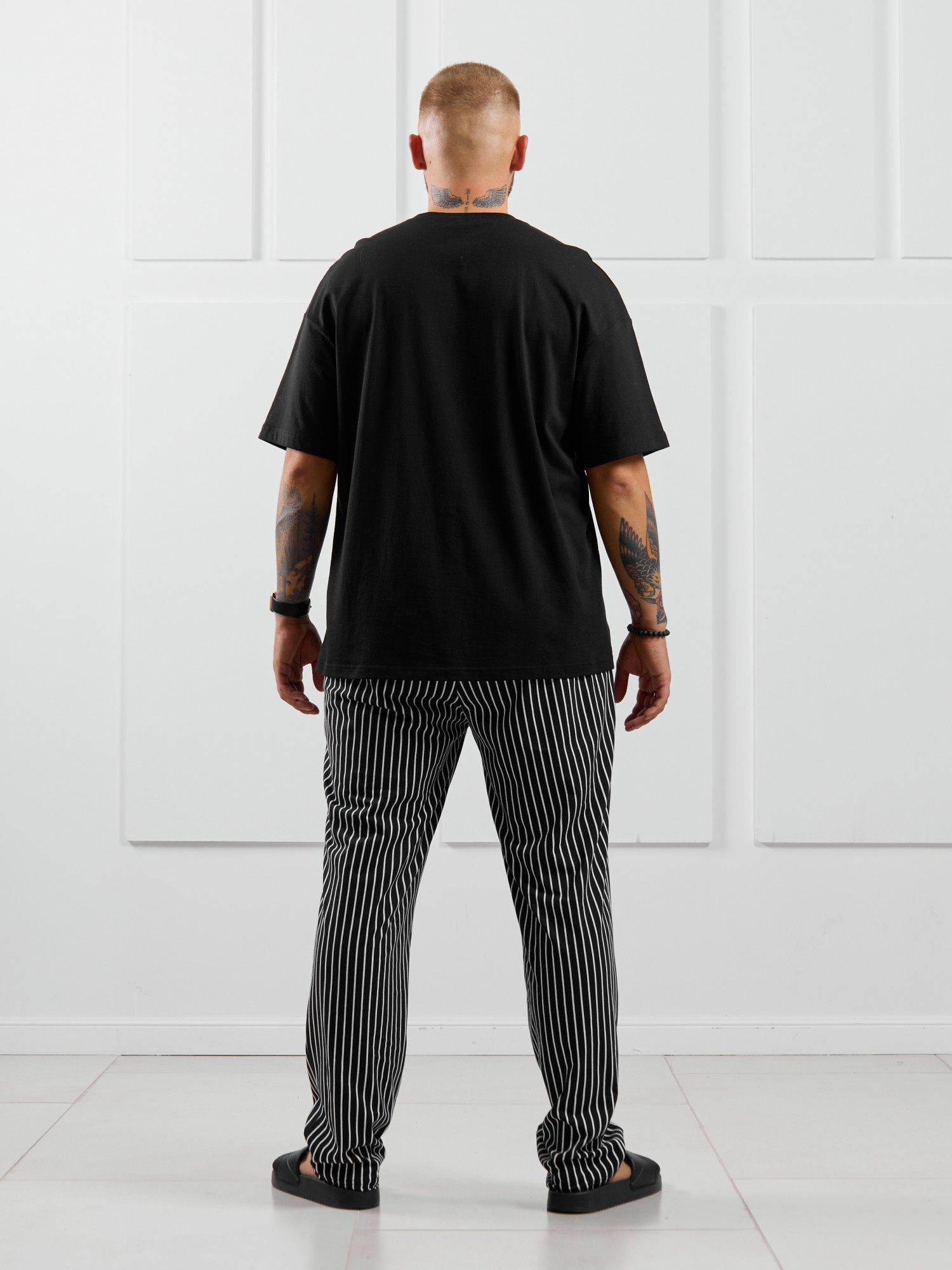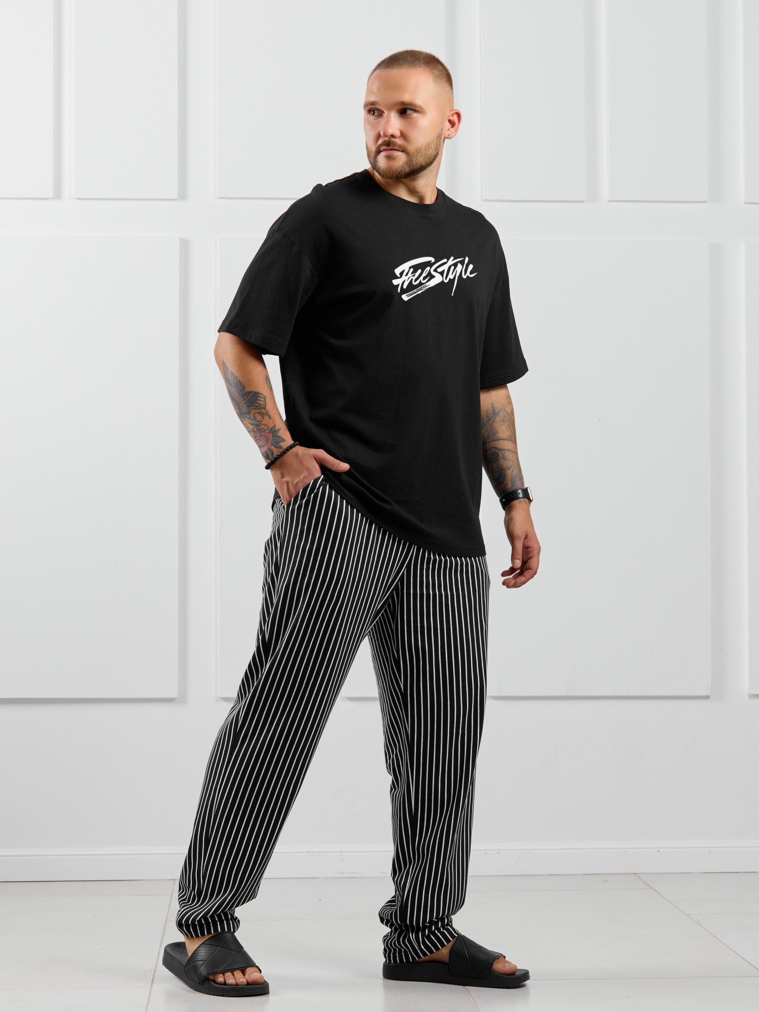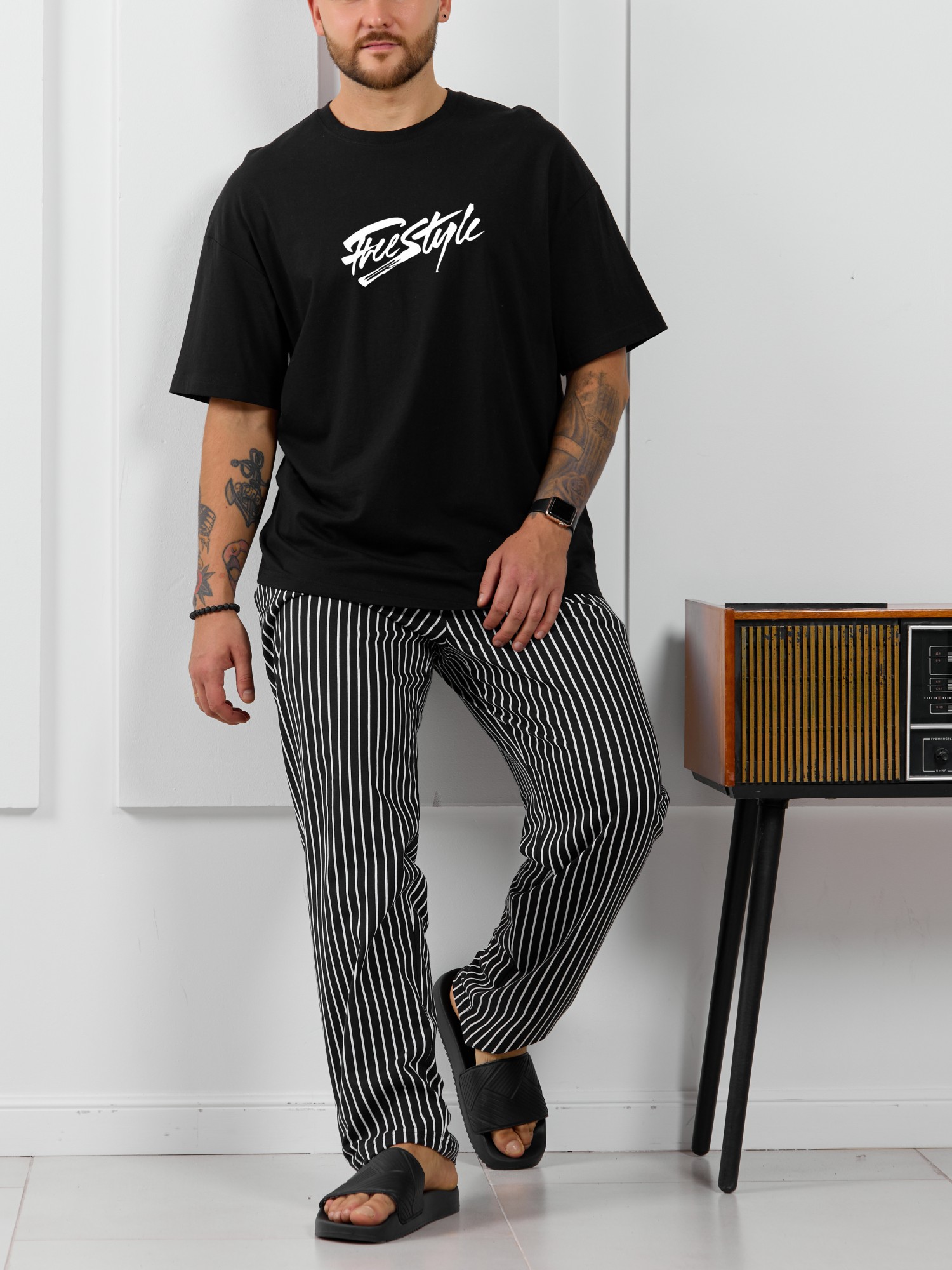 Костюм мужской, состоящий из футболки и брюк. Футболка однотонная с принтом на груди; модель свободная, со спущенной линией плеч. Брюки из полотна с набивным рисунком в узкую черно-белую полоску, прямые, с боковыми карманами с обтачными входами, на притачном поясе с отстроченной эластичной тесьмой.
