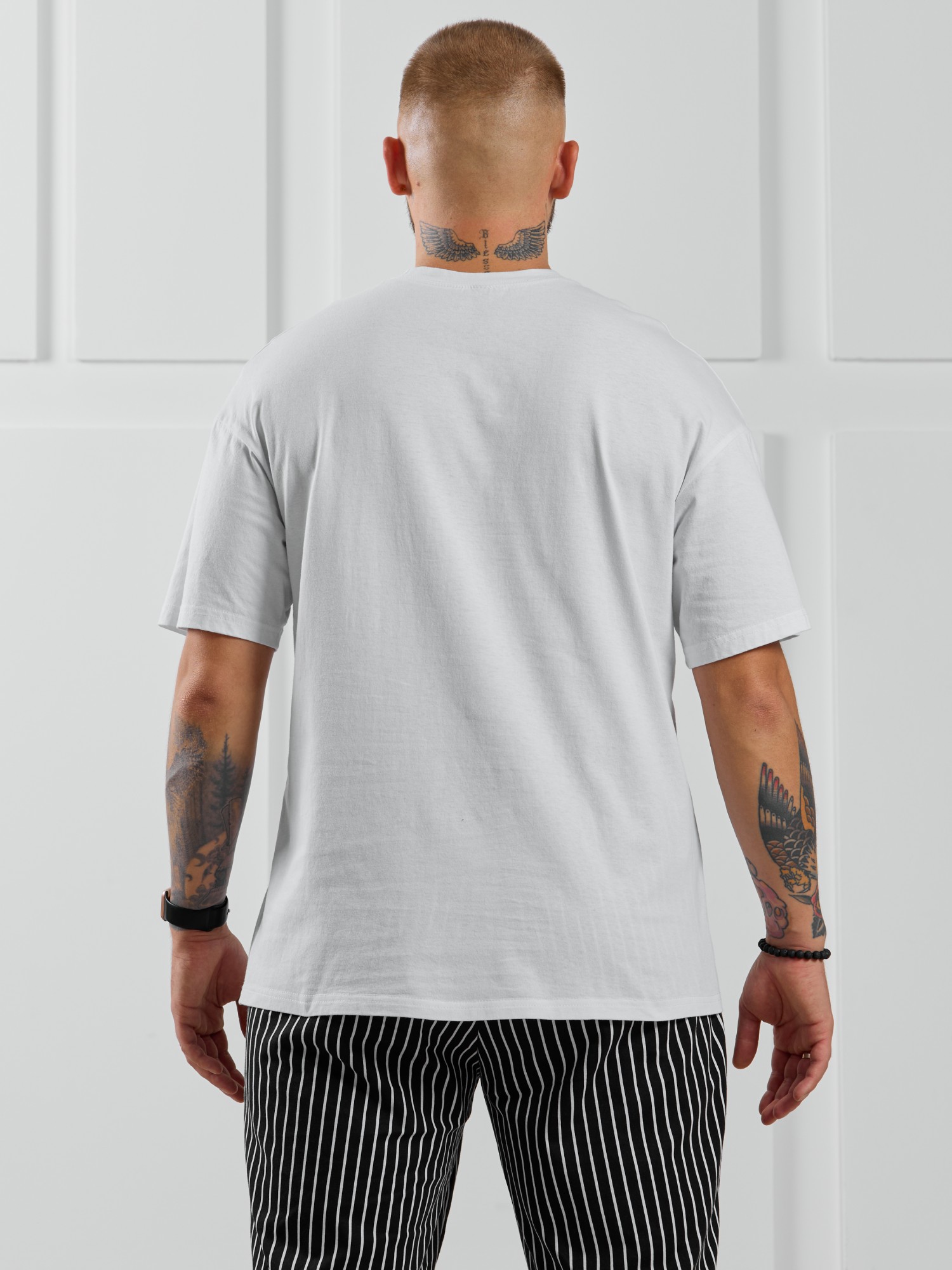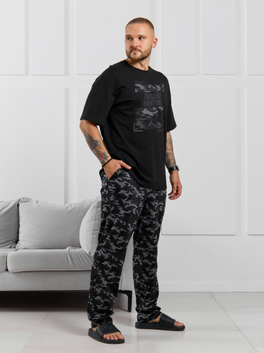 Костюм мужской, состоящий из футболки и шорт. Футболка однотонная с принтом на груди; модель свободная, со спущенной линией плеч. Шорты из полотна с набивным рисунком в узкую черно-белую полоску, с боковыми карманами с обтачными входами, на притачном поясе с отстроченной эластичной тесьмой.