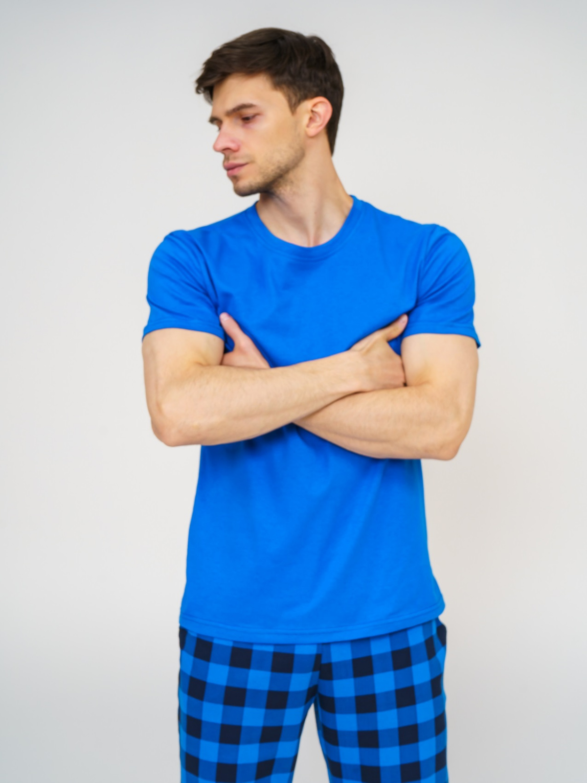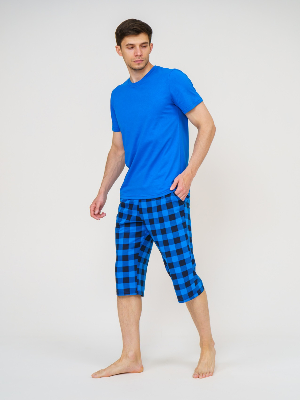 Стильный и удобный мужской домашний костюм отличный вариант одежды на все случаи жизни. Комплект для дома с футболкой и шортами сшит из материала, в составе которого 100% хлопок. Удобные и дышащие бриджи с двумя карманами и средней посадкой. У них универсальная длина, поэтому этот комплект смело можно носить не только как домашний, но или как пляжный или спортивный костюм. Яркая однотонная футболка без лишних элементов отделки порадует мужчин своим удобством и комфортом. Классический крой Футболки с коротким рукавом и круглым вырезом подойдет любому типу фигуры и любому возрасту.