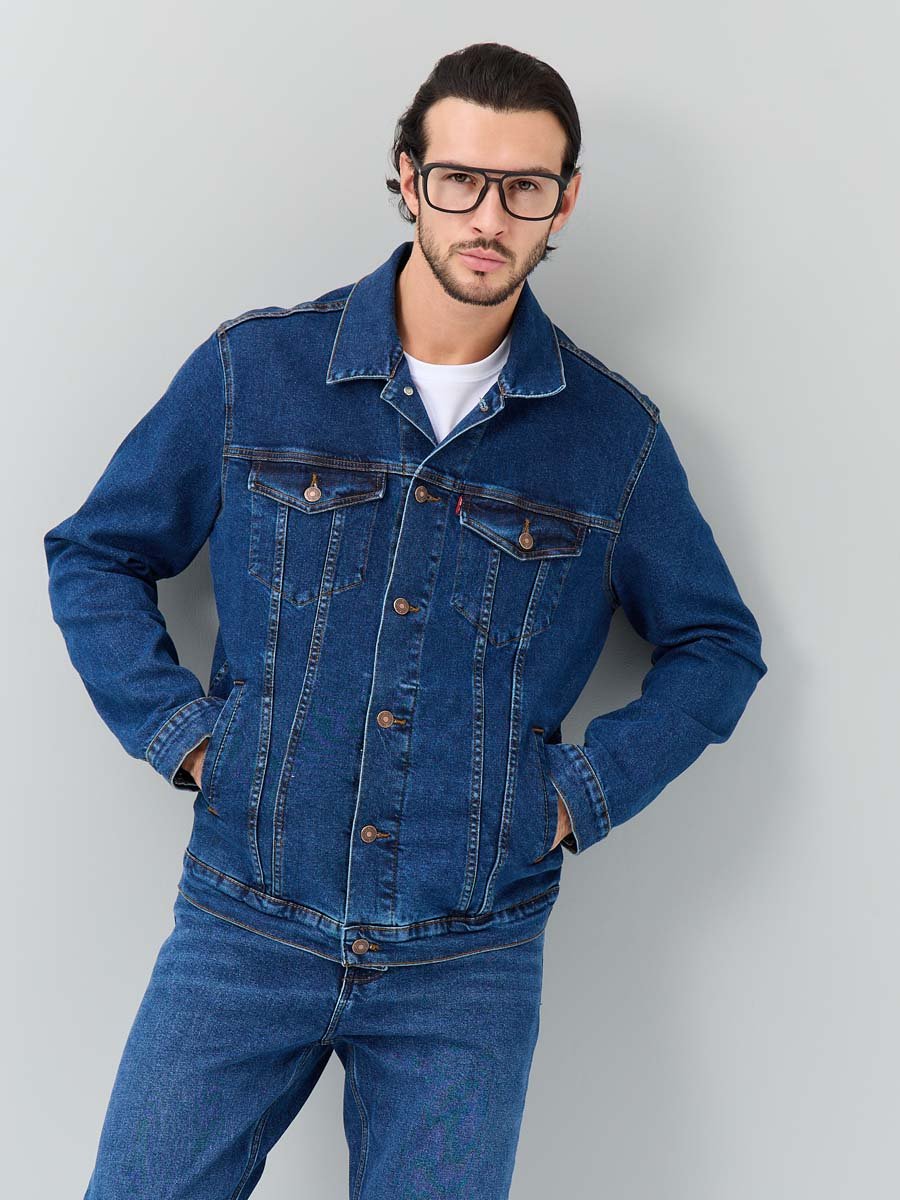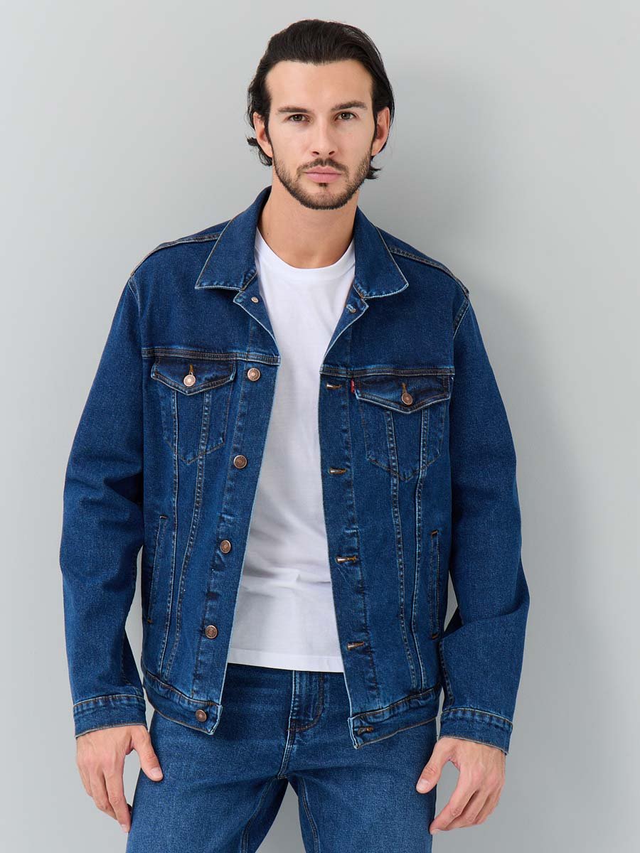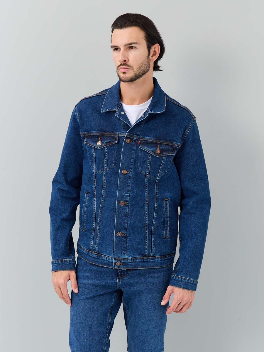 Классическая универсальная джинсовая куртка. Прямой силуэт, пройма и рукава обеспечивают комфорт и не сковывают движения, по низу рукавов манжеты, застегивающиеся на пуговицу; небольшой воротник; на груди карманы с клапаном, также застегивающимся на пуговицу; функциональные боковые прорезные карманы "в листочку"; на поясе по бокам куртки хлястик и две пуговицы, которые позволяют регулировать длину обхвата по поясу. Выполнена из слабоэластичной плотной ткани denim. Классическая темная стирка с потертостями спереди и сзади, а также по швам.