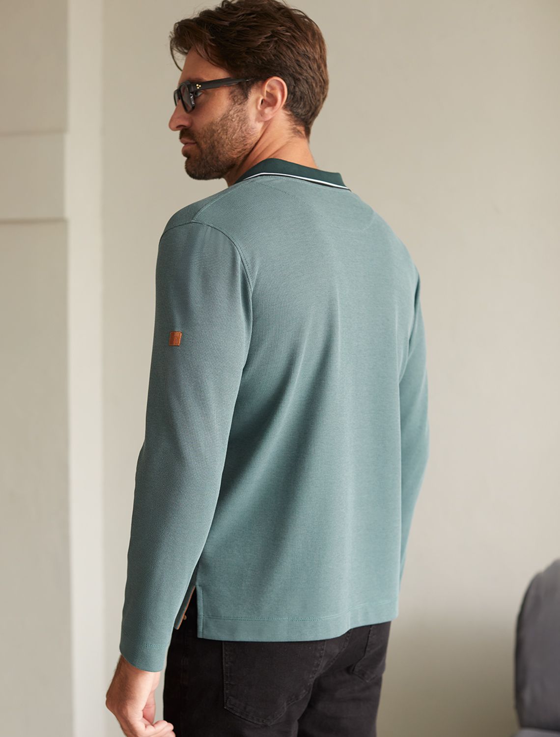 Стильный лонгслив не яркого изумрудного цвета с плетеным воротником поло с застежкой на пуговицы выполнен из премиального хлопка в сочетании с эластаном .Невероятно мягкая ткань из натуральных волокон - она едва ощутима на коже и словно обнимает тело. Материал при касании кажется бархатистым, при движении он словно повторяет все мельчайшие линии фигуры. По свойствам материал сочетает в себе практичность и нежность: отлично провускает воздух, сохраняя ощущение свежести в течение всего дня, при этом созраняет тепло в прохладную погоду.Идеально подходит для чувствительной кожи, не вызывает раздражения и дискомфорта. Удобный отложной воротник делает образ современным и стильным, а длинные рукава с манжетами защищают руки при ветреной погоде.