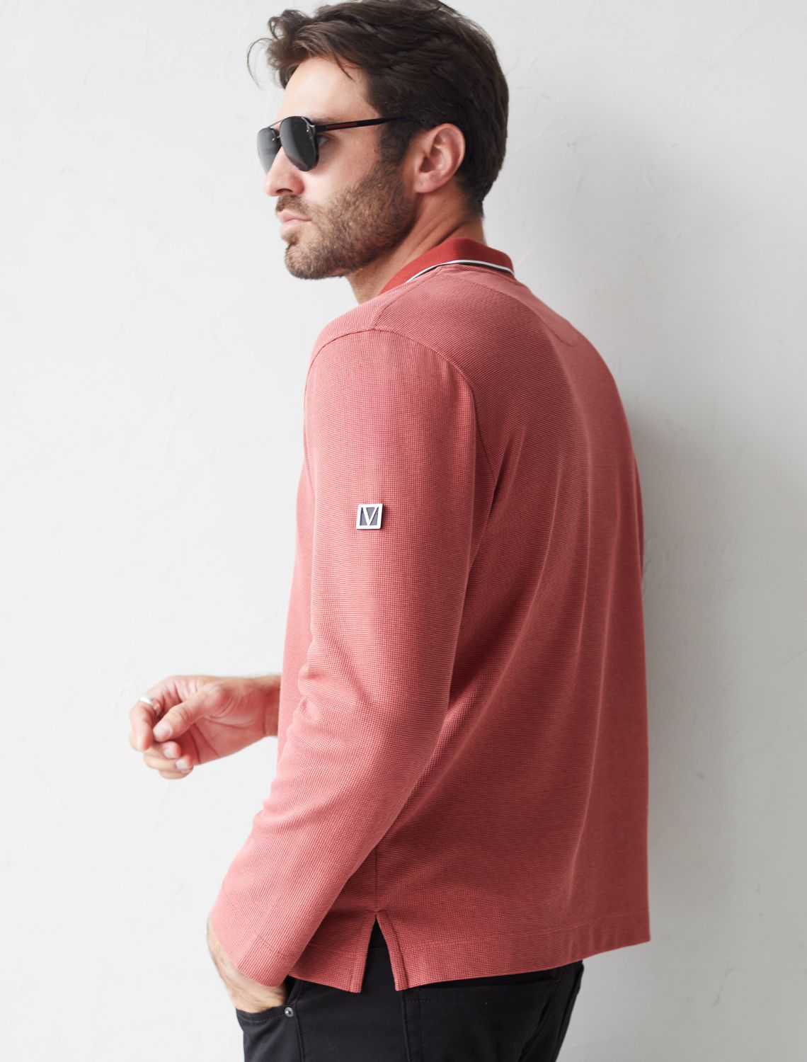 Стильный лонгслив кирпичного цвета с плетеным воротником поло с застежкой на пуговицы выполнен из премиального хлопка в сочетании с эластаном .Невероятно мягкая ткань из натуральных волокон - она едва ощутима на коже и словно обнимает тело. Материал при касании кажется бархатистым, при движении он словно повторяет все мельчайшие линии фигуры. По свойствам материал сочетает в себе практичность и нежность: отлично провускает воздух, сохраняя ощущение свежести в течение всего дня, при этом созраняет тепло в прохладную погоду.Идеально подходит для чувствительной кожи, не вызывает раздражения и дискомфорта. Удобный отложной воротник делает образ современным и стильным, а длинные рукава с манжетами защищают руки при ветреной погоде.