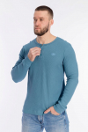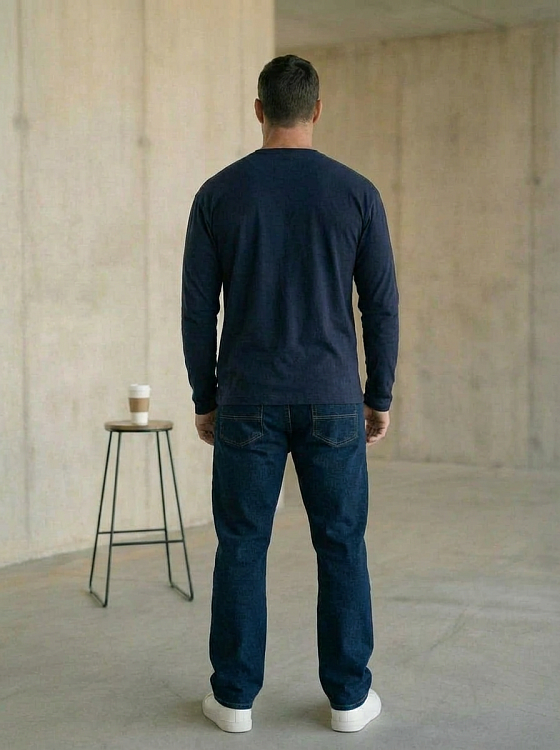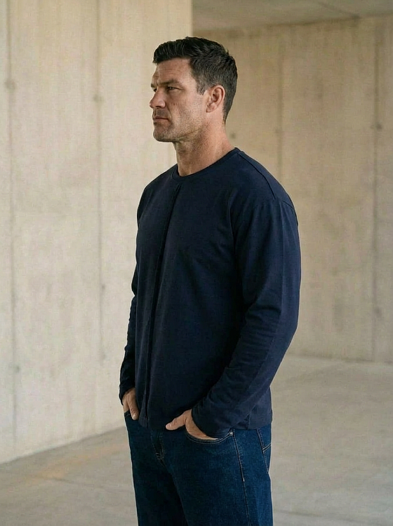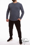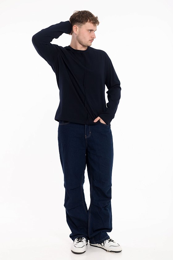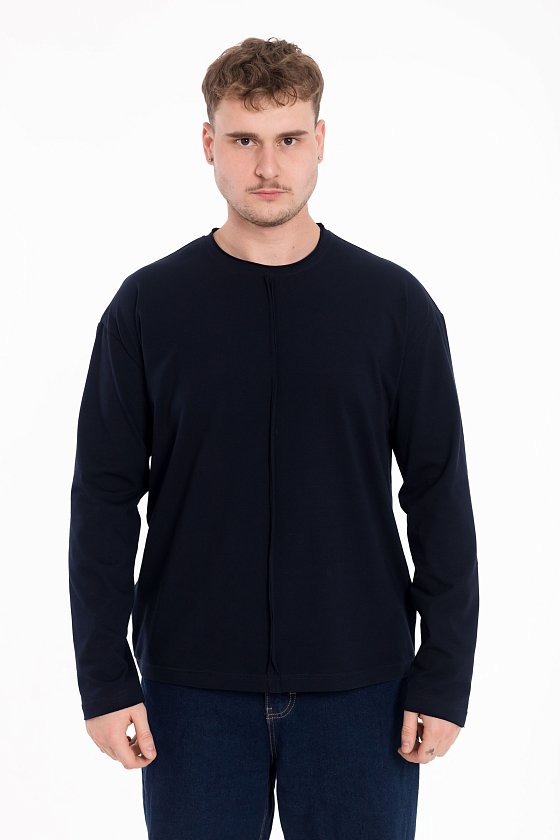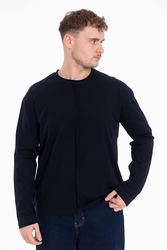 Мужской лонгслив выполнен из однотонной кулирки с лайкрой. Модель имеет спущенное плечо и декоративный шов спереди, выполненный “налицо”. Низ рукавов и планка горловины оставлены с открытым срезом — края слегка закручиваются, создавая аккуратный декоративный эффект. Лонгслив комфортный в носке, мягко прилегает и подходит для повседневного использования.