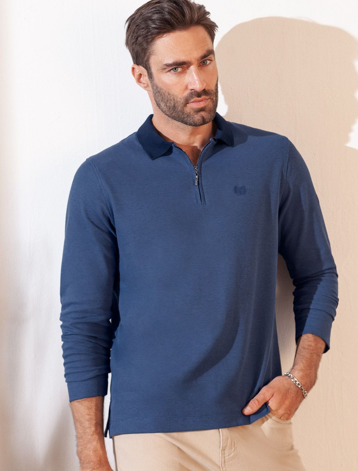 Лонгслив из мягкого фактурного трикотажа с плетеным воротником поло на молнии