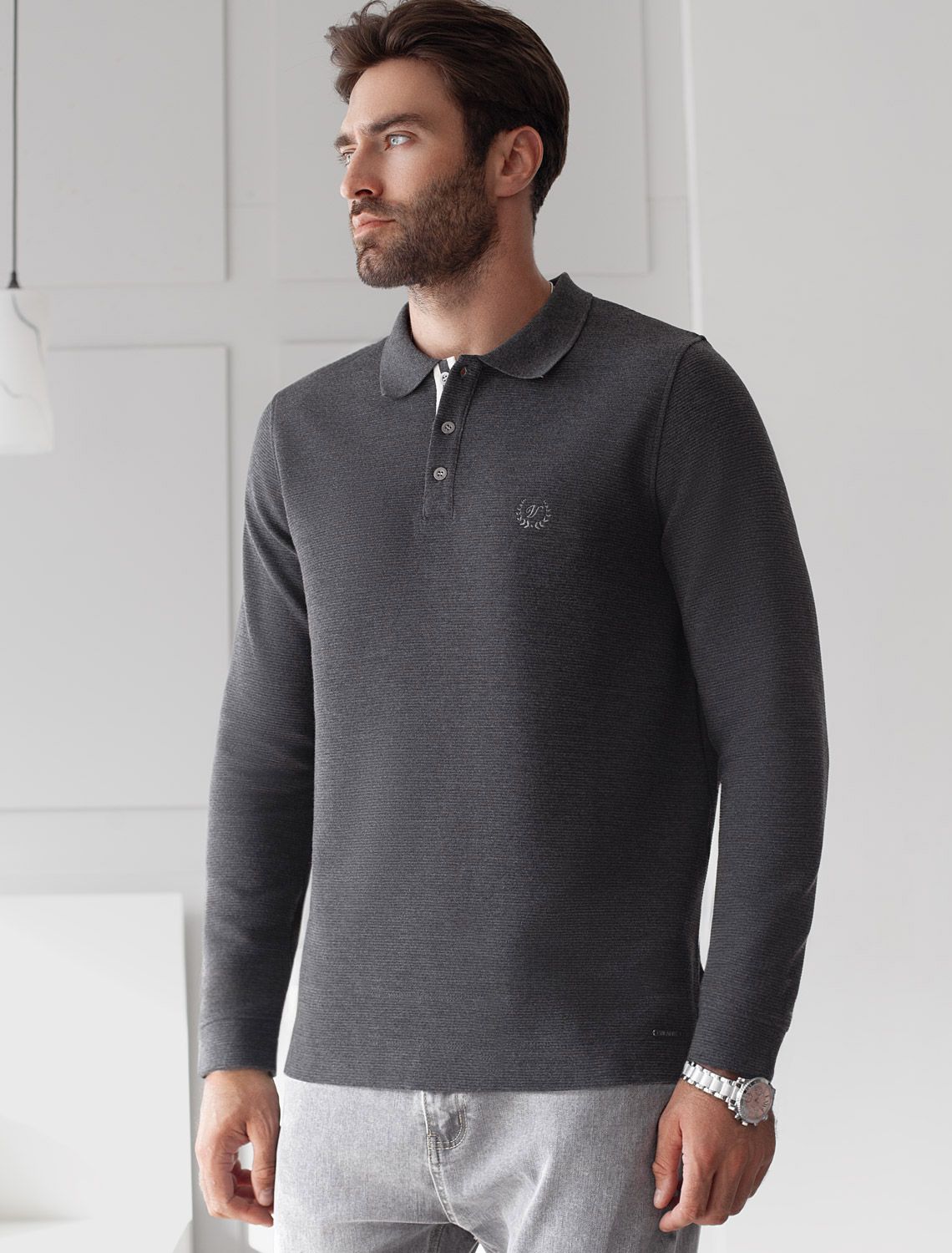 Стильный лонгслив темно-серого цвета с эффектом меланж с плетеным воротником поло с застежкой на металлические пуговицы выполнен из премиального хлопка в сочетании с эластаном . Невероятно мягкая ткань из натуральных волокон - она едва ощутима на коже и словно обнимает тело. Материал при касании кажется бархатистым, при движении он словно повторяет все мельчайшие линии фигуры. По свойствам материал сочетает в себе практичность и нежность: отлично проgускает воздух, сохраняя ощущение свежести в течение всего дня, при этом в нем тепло в прохладную погоду.Идеально подходит для чувствительной кожи, не вызывает раздражения и дискомфорта. Удобный отложной воротник с контрастной отделкой делает образ современным и стильным, а длинные рукава с манжетами защищают руки при ветреной погоде.