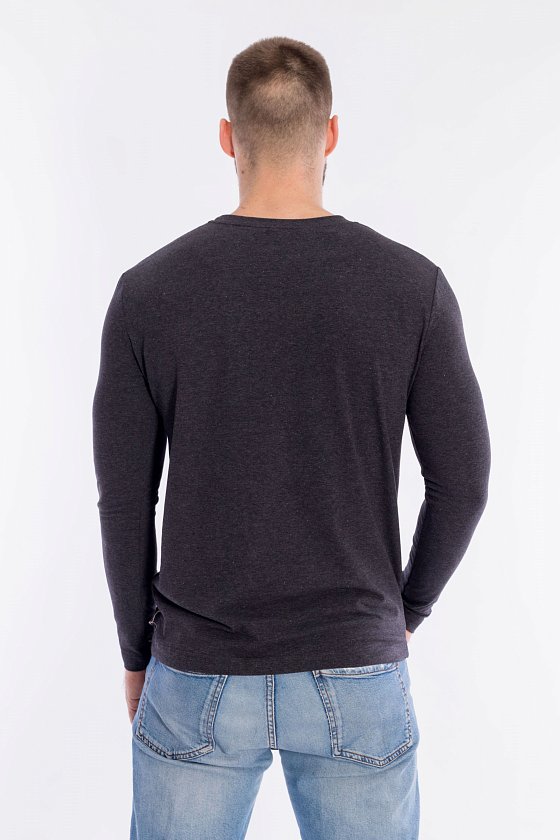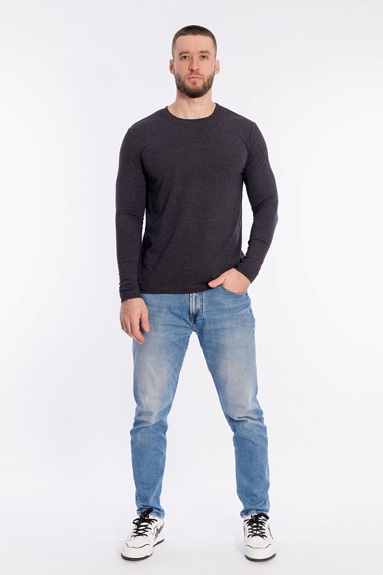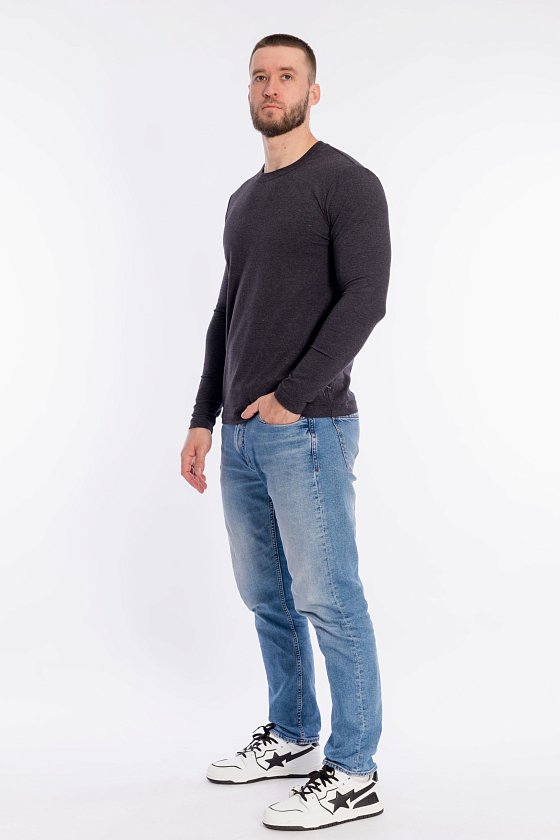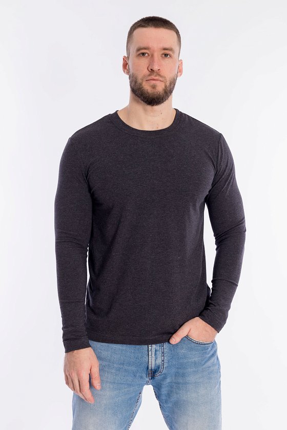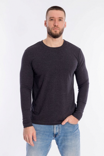 Лонгслив для мужчин выполнен из кулирки с лайкрой. Модель с длинными рукавами и круглым вырезом горловины, оформленным планкой.