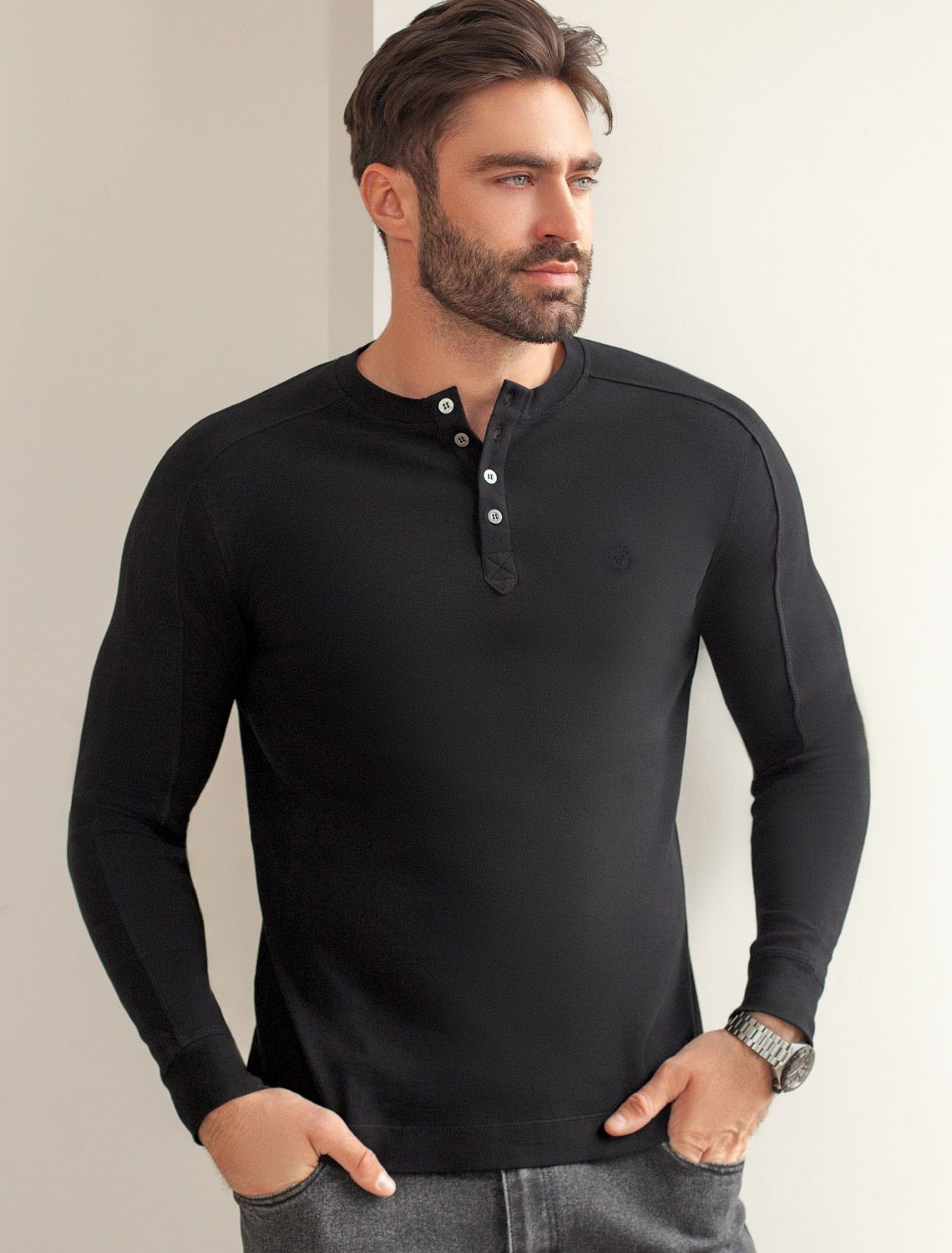 Лонгслив черного цвета выполнен из премиального хлопка с эластаном и идеально подходит для повседневной носки. Круглый ворот с застежкой на металлические пуговицы с логотипом бренда добавляет образу стильный акцент, делая этот лонгслив универсальным выбором как для парней, так и для мужчин любого возраста. Декоративные швы на рукавах и минималистичная вышивка в виде эмблемы VILATTE придают лонгу современный вид и подчеркивают его уникальность.