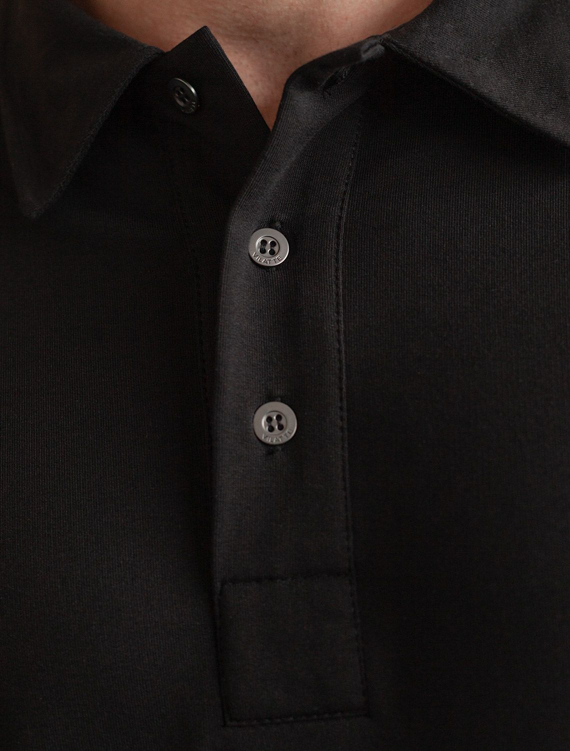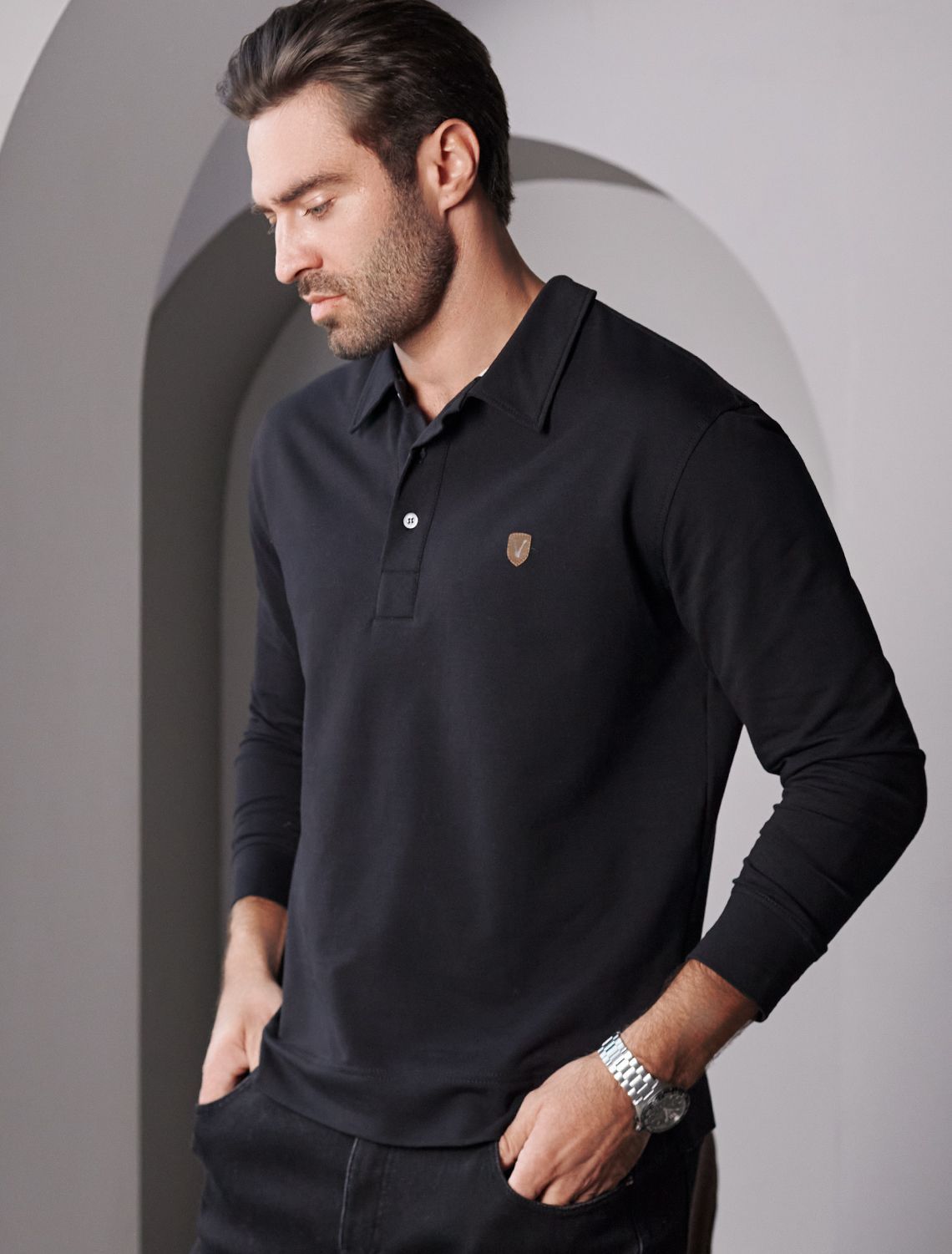Стильный лонгслив черного цвета с воротником поло выполнен из премиального хлопка в сочетании с эластаном . Натуральная ткань обеспечивает легкость, воздухопроницаемость и приятные тактильные ощущения даже когда жарко, позволяет не перегреваться и поддерживает комфортный микроклимат в течение всего дня. Удобный отложной воротник на аккуратных пуговицах делает образ современным и стильным, а длинный рукав защищает руки при ветреной погоде. Поло хорошо садится по фигуре благодаря добавлению эластичных волокон — такой вариант подходит для мужчин любого роста и размеров, не стесняет движений и создает ощущение свободы и легкости.