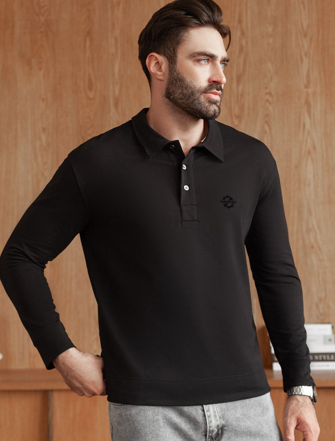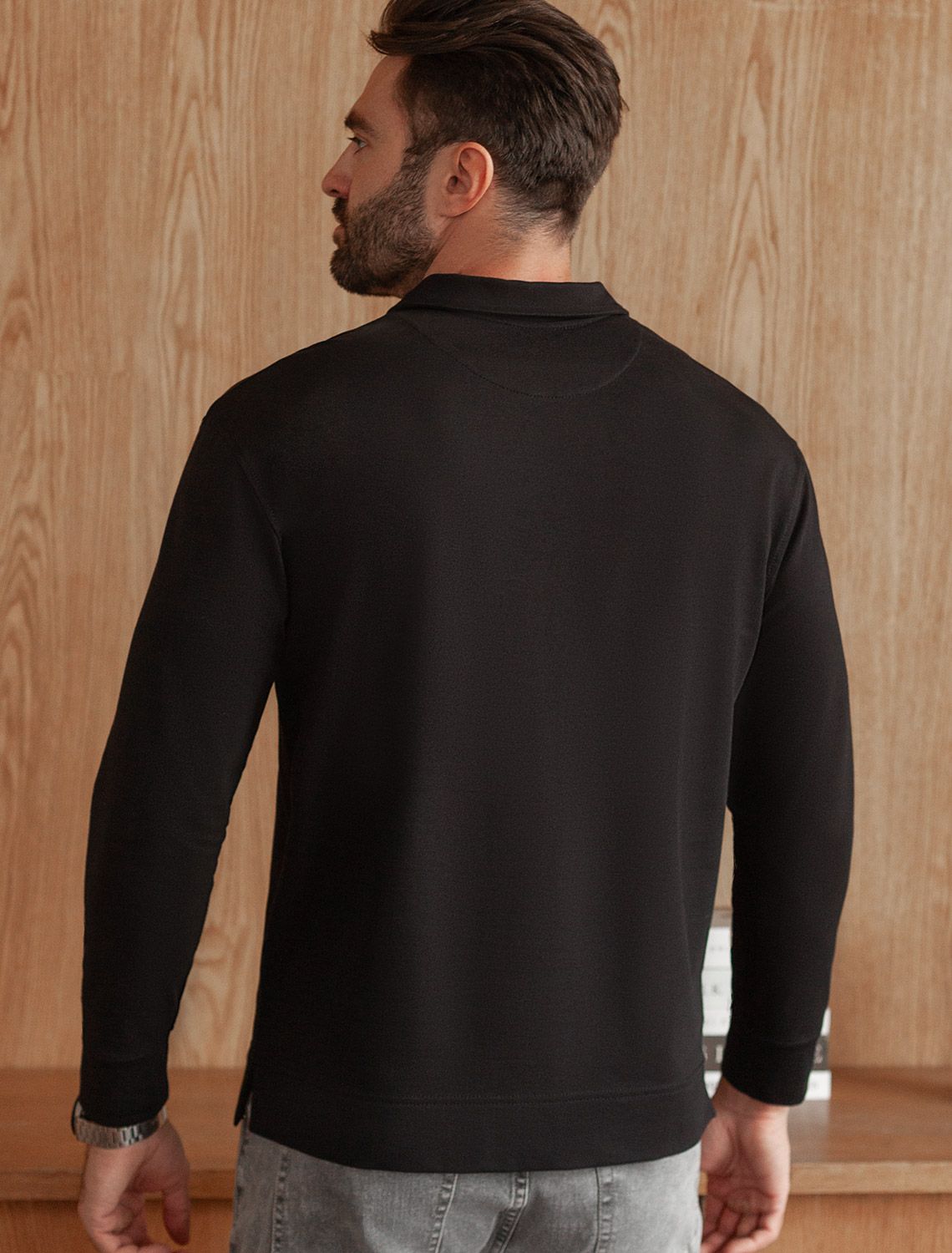 Лонгслив с воротником поло на пуговицах из премиального хлопка с эластаном U49.064 черный