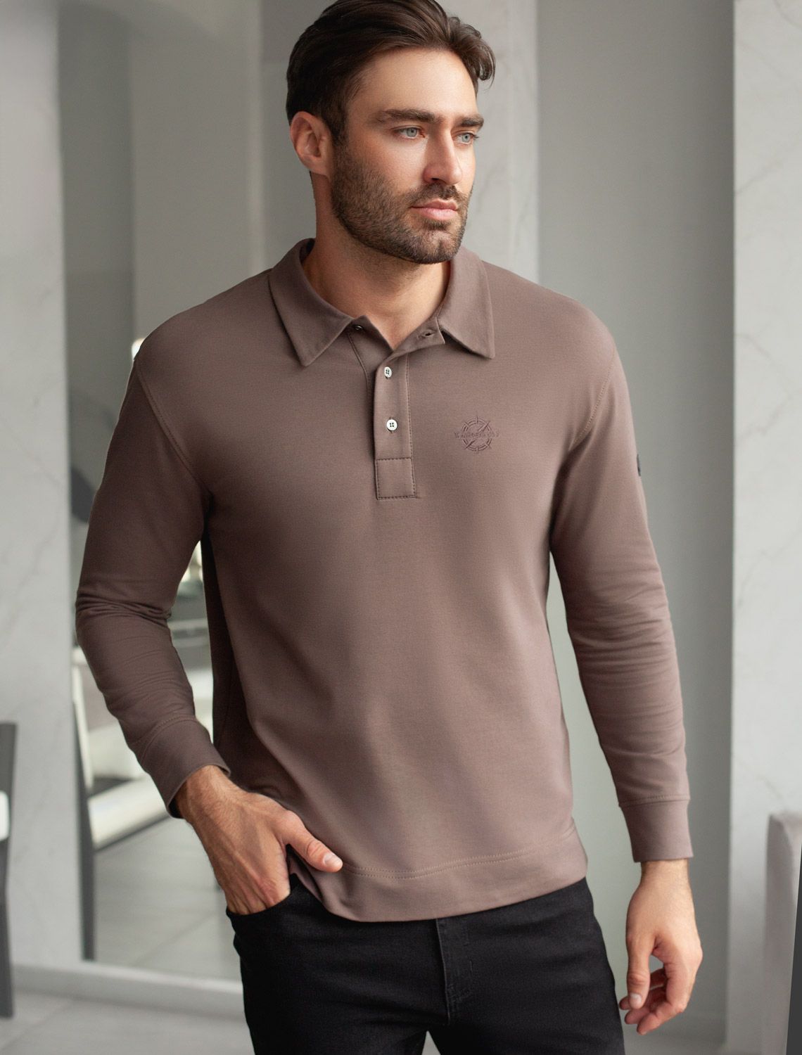 Лонгслив с воротником поло на пуговицах из премиального хлопка с эластаном U49.064 кофейный
