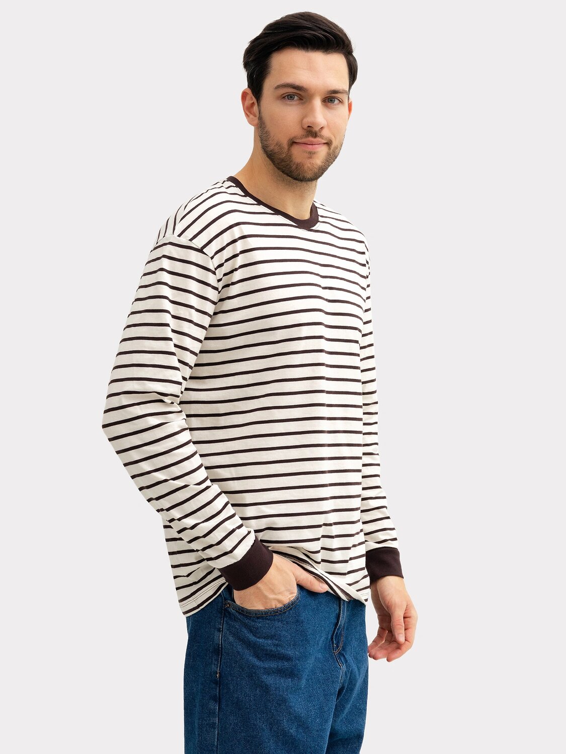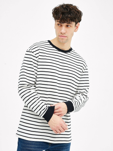 Стильный мужской лонгслив-тельняшка прямого, свободного силуэта, выполнен из высококачественного хлопка. Вырез круглый, классический, с контрастной окантовкой. Рукава длинные, свободные, с расширенными манжетами. Отличный универсальный лонгслив для casual-образов на каждый день. Дополнить такой лонг мужской в полоску легко и просто стильным низом. Его можно носить самостоятельно, как отдельный элемент или с другой верхней одеждой, создав при этом модный многослойный аутфит. Материал изделия износостойкий, мягкий и приятный к телу, не линяет и не выцветает при множественных стирках. Если вы в поиске базовой универсальной вещи, то этот лонг-тельняшка - отличный вариант!