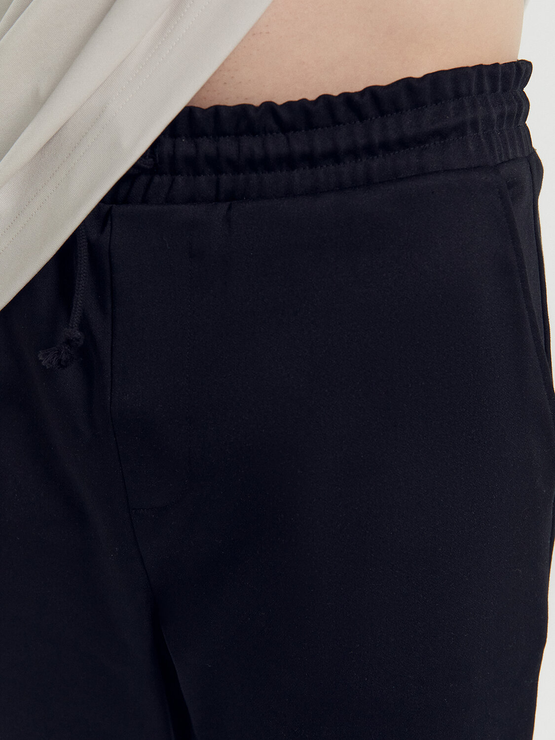 Брюки прямые, посадка средняя. Пояс отрезной из основного полотна с эластичной тесьмой внутри. С внешней стороны пояса пробиты петли и втянут шнур.