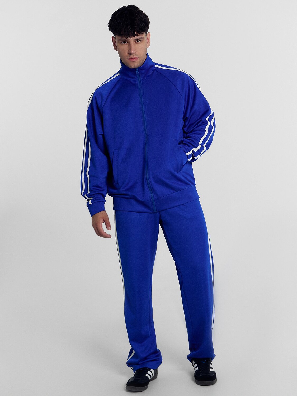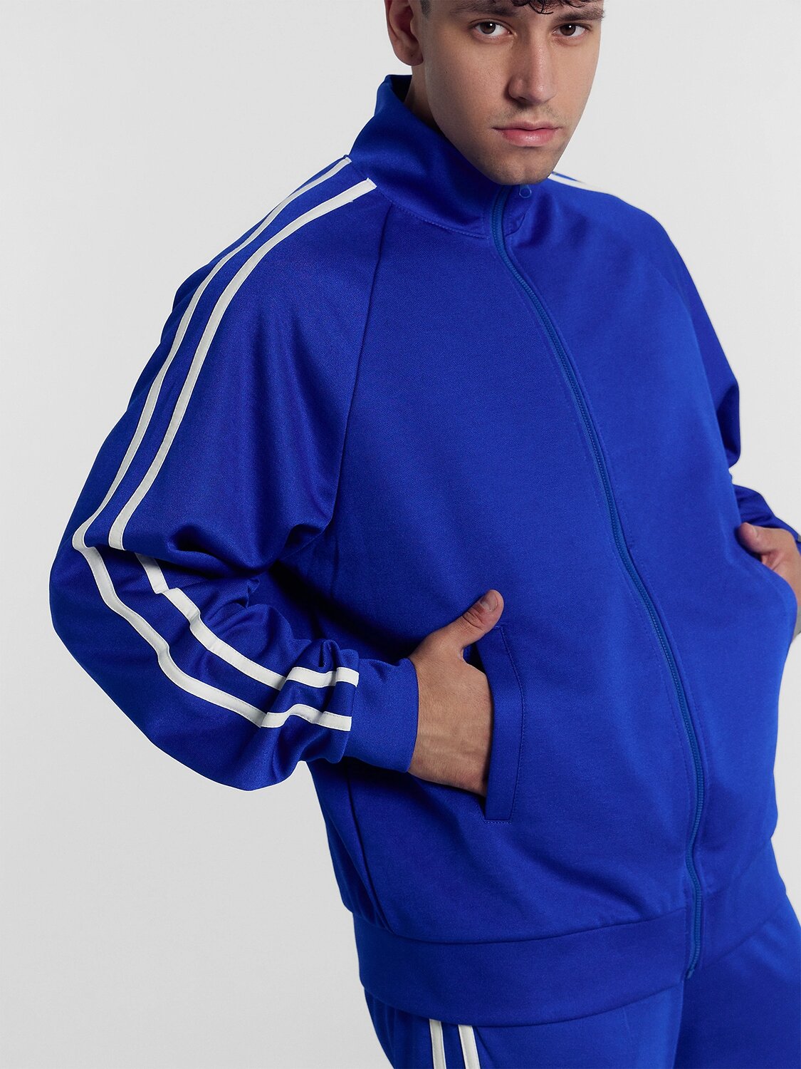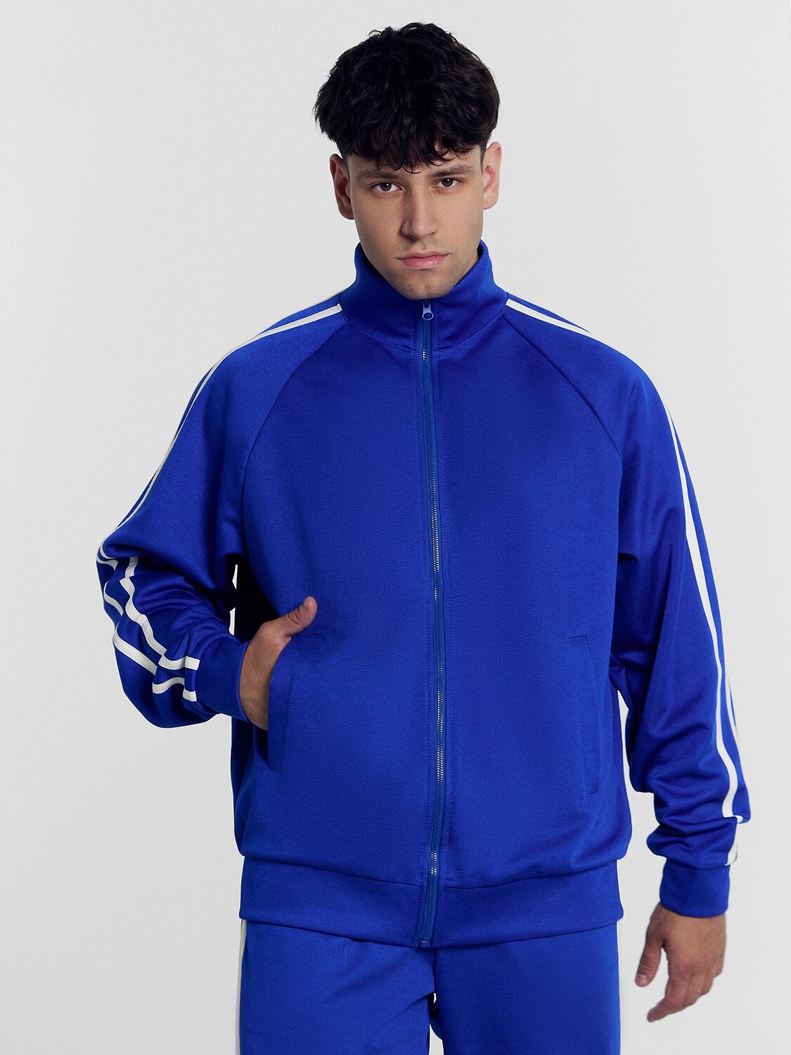 Рукав реглан, с отрезными манжетами. По центру рукава настрочены лампасы из кулирки.