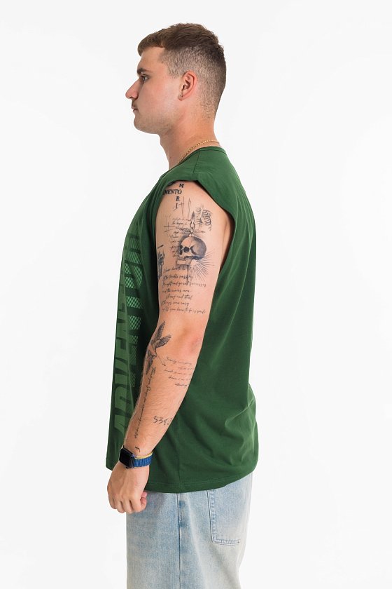 Майка с широким плечом выполнена из однотонной кулирки, 100% хлопок. Круглая горловина и проймы обработаны широкой бейкой. Спереди расположен принт.