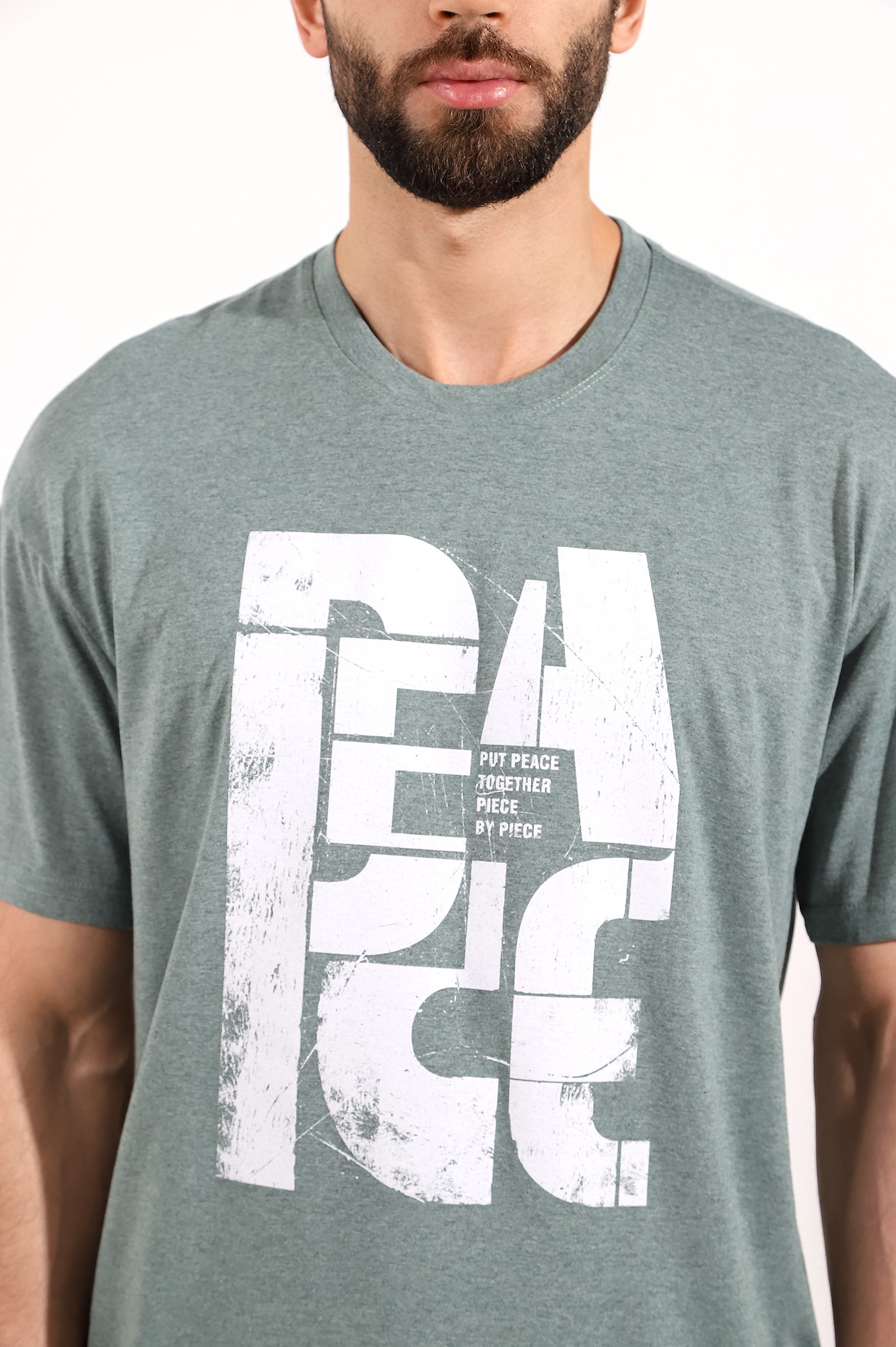 Футболка мужская из меланжированного трикотажного полотна "кулирка", свободного покроя, со спущенным плечом и втачными короткими рукавами. Горловина овальной формы обработана втачной планкой. По шву втачивания планки настрочена двойная отделочная строчка. В центре переда - принт, выплненный в технике шелкографии.