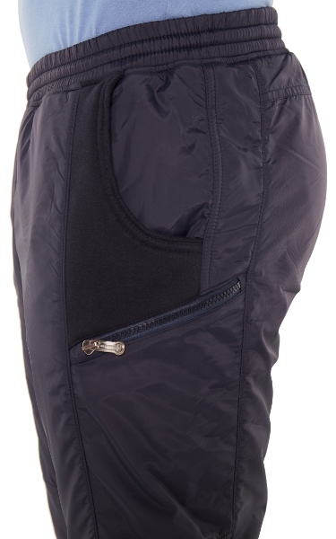 Зимние комбинированные брюки с поясом на резинке. Подкладка флис 220гр/м2. Для дополнительной фиксации в пояс с внутренней стороны вставлен шнурок. Брючины заужены к низу и заканчиваются манжетами. Полукруглые передние карманы выполнены из 3-х ниточного футера. Ниже расположены дополнительные карманы, фиксируемые тракторными молниями. Колени выделены горизонтальными рельефами. Сзади кокетка.