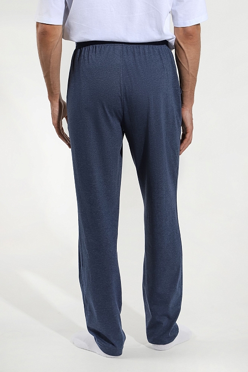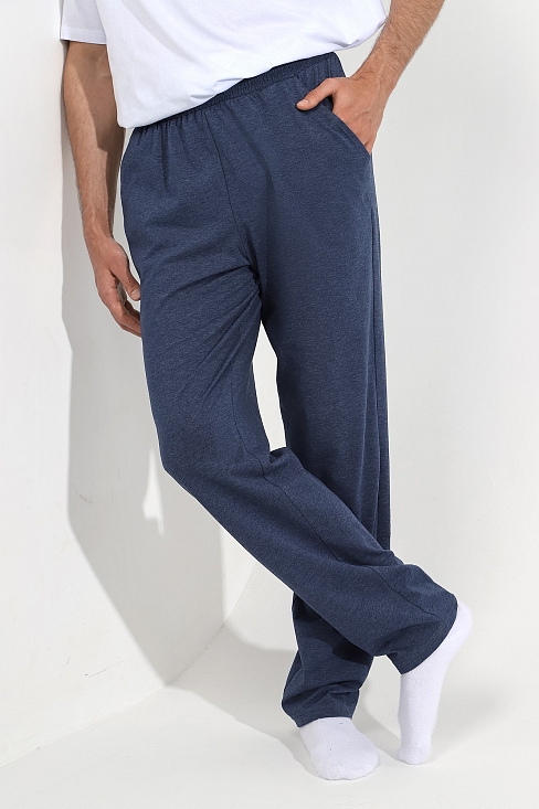 Брюки мужские из меланжированного трикотажного полотна "кулирка", прямого силуэта,  с карманами в боковых швах, на притачном поясе с эластичной тесьмой внутри. В центре пояса - две обметанные петли , через которые продет шнурок для регулирования степени прилегания шорт по талии.