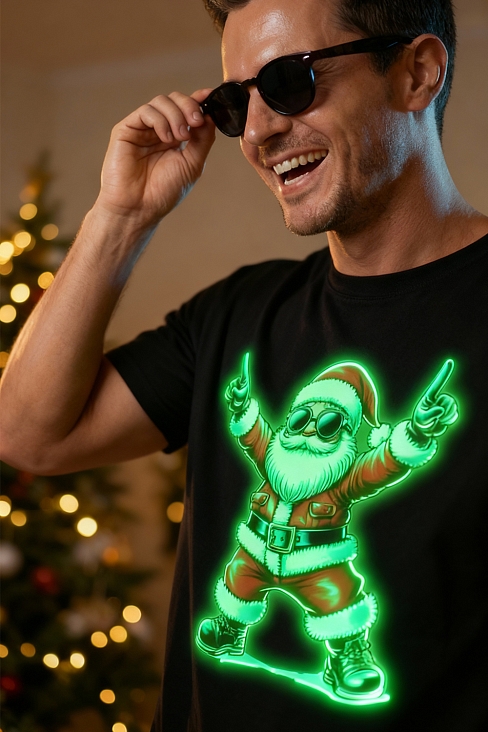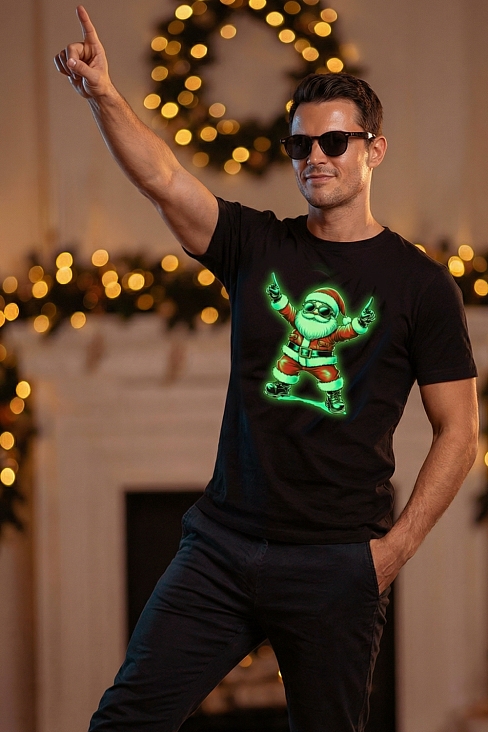 Представьте: Новый год, вечеринка в разгаре, а вы в стильной футболке с Сантой, который не просто раздает подарки, а зажигает на полную!