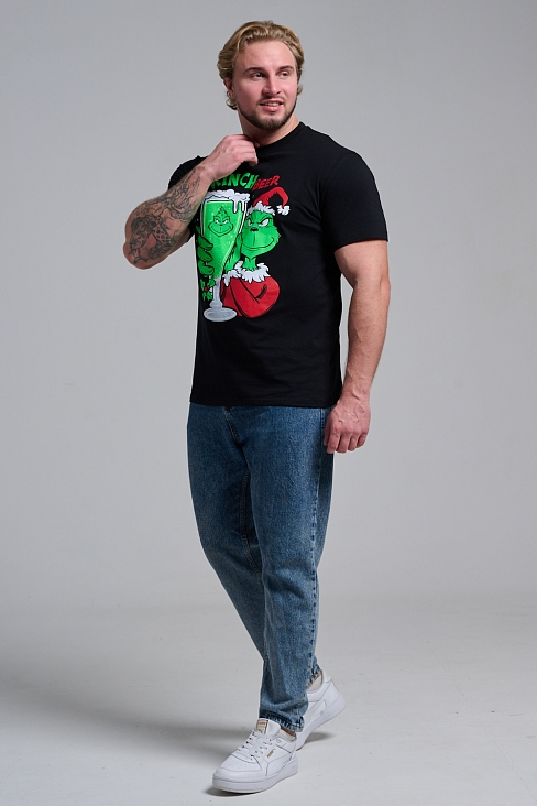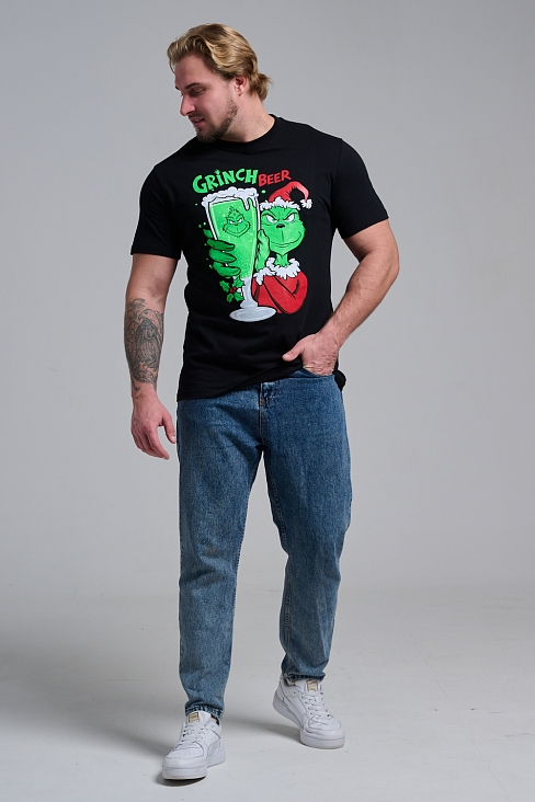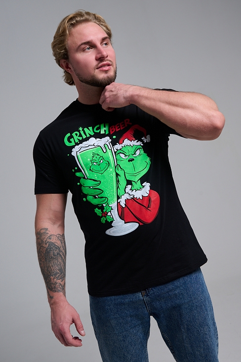 Чёрная хлопковая футболка с забавным принтом: Гринч в красной шапке держит большой бокал пива с  пеной! Надпись Grinch Beer сверху, яркий зелёно-красный дизайн для новогоднего юмора.